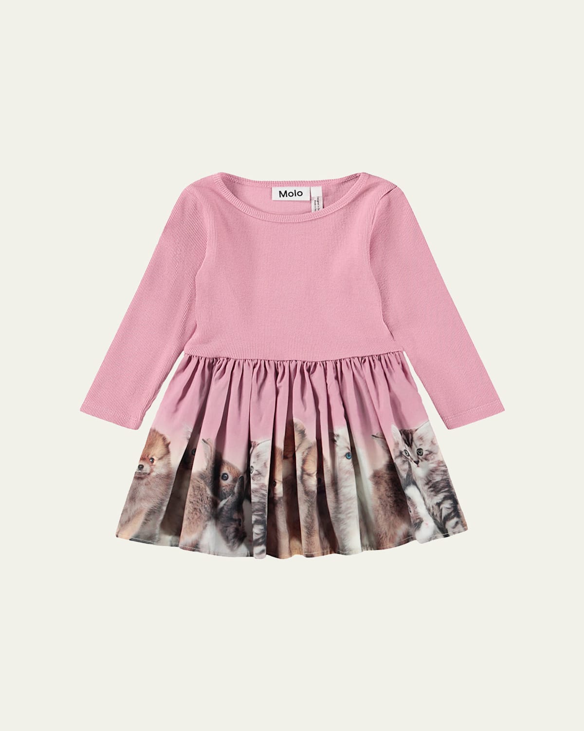 Molo "Candi" dress pairs a ribbed top with a stuffed animalprint circle skirt Crew neckline Long sleeves Hem falls above the knee Aline silhouette Pullover style GOTScertified organic cotton Imported
