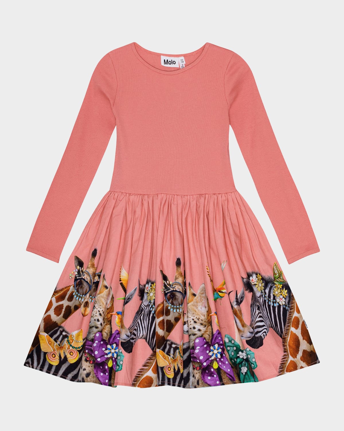Molo "Casie" dress combo dress with an animal motif at skirt Round neckline Long sleeves Empire waist Hem hits around the knee Aline silhouette Cotton Imported