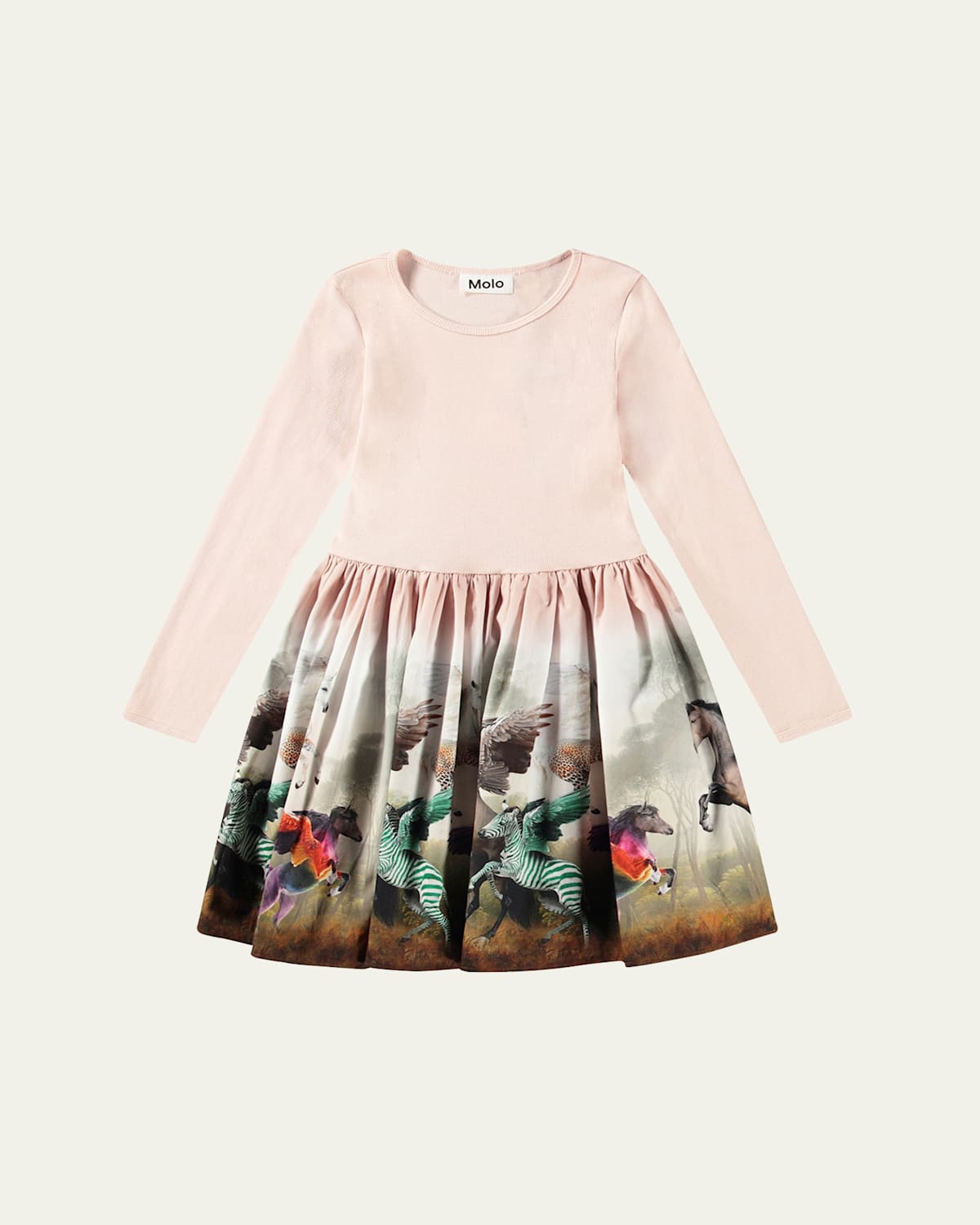 Molo "Casie" dress combo dress with an animal motif at skirt Round neckline Long sleeves Empire waist Hem hits around the knee Aline silhouette Cotton Imported