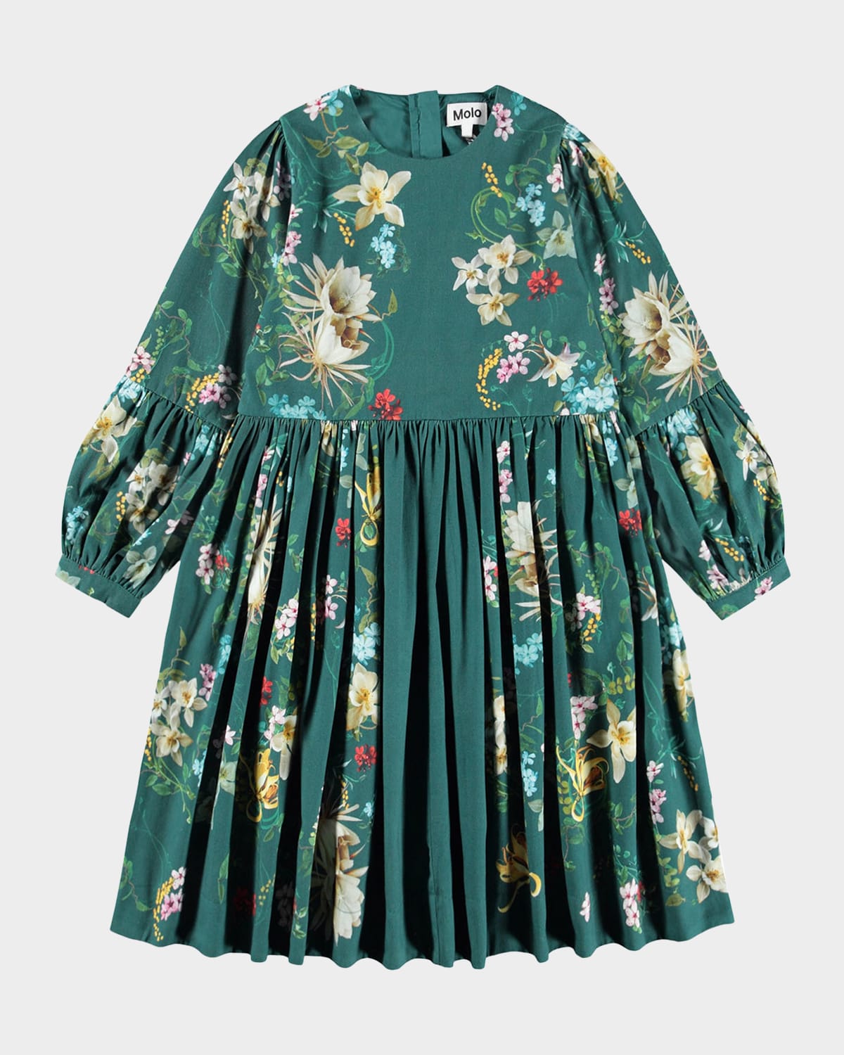 Charming and colorful, the Molo "Cece" floralprint flannel dress is slightly oversized with gathering at the skirt. Round neckline Long sleeves Button cuffs Hem falls below the knee Aline silhouette Invisible back zip closure Organic cotton Imported