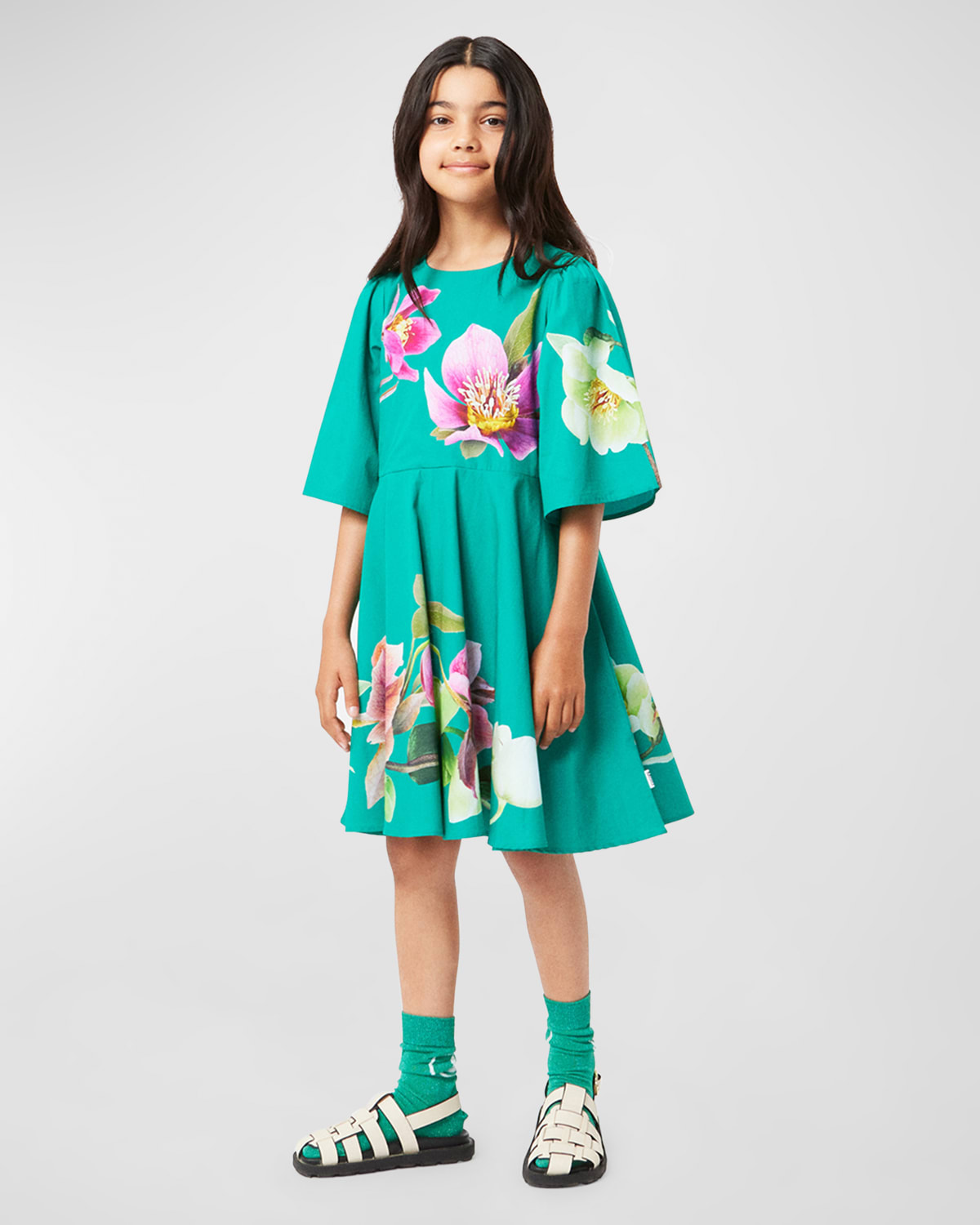 Girl's Bell-Sleeve Floral-Embroidered Velvet Dress, Size 6-14