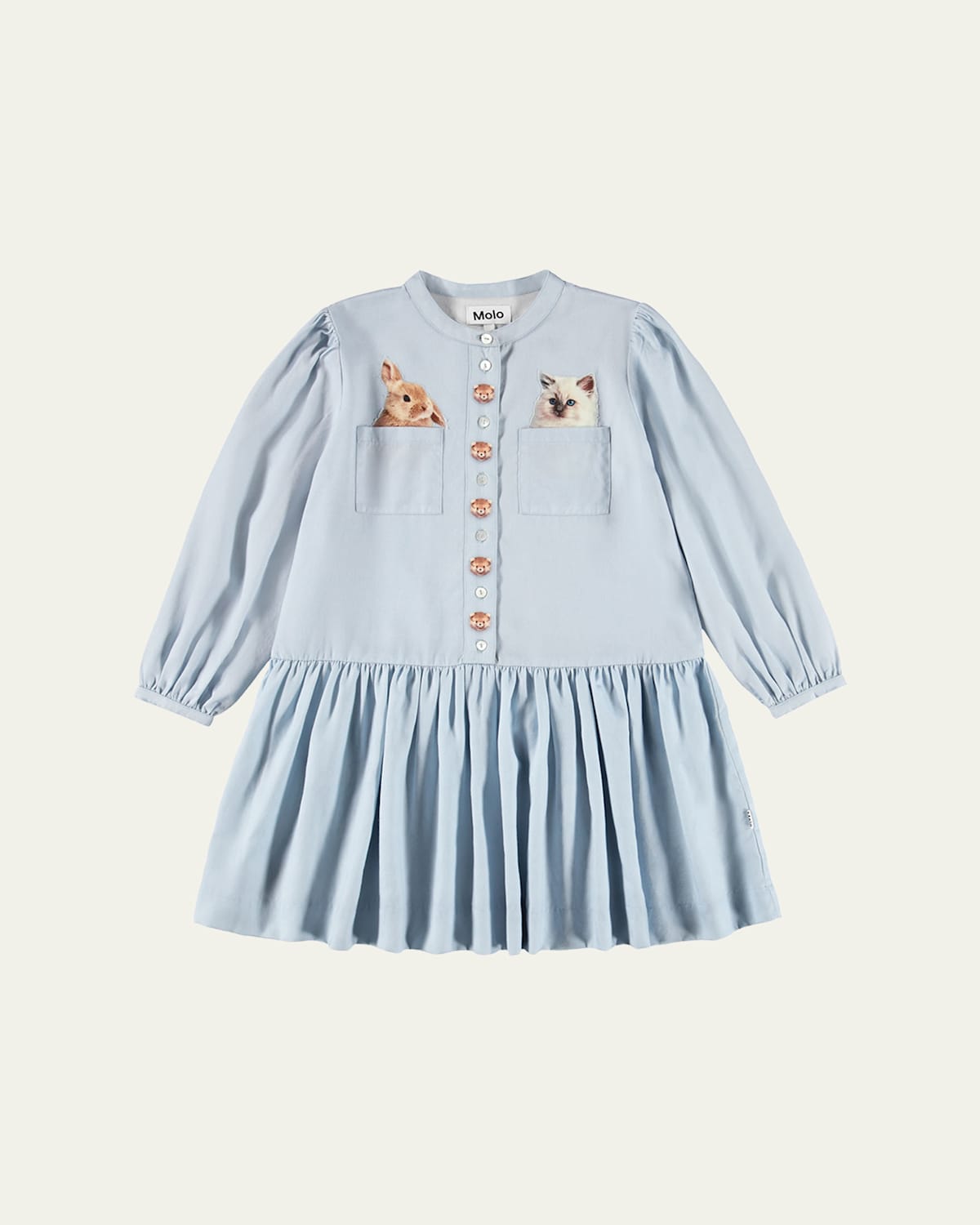 Molo dress embellished with pretty buttons and an adorable print of cute animals above the pockets Band collar; button placket Long sleeves Chest patch pockets Attached circular skirt Hem falls above the knee Button front closure Viscose Imported