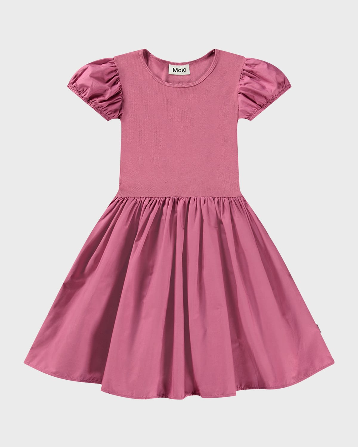 Molo "Cleopatra" combo dress with puff sleeves and flared skirt Round neckline Short sleeves Hem hits around the knee Slipover style Aline silhouette Cotton Imported