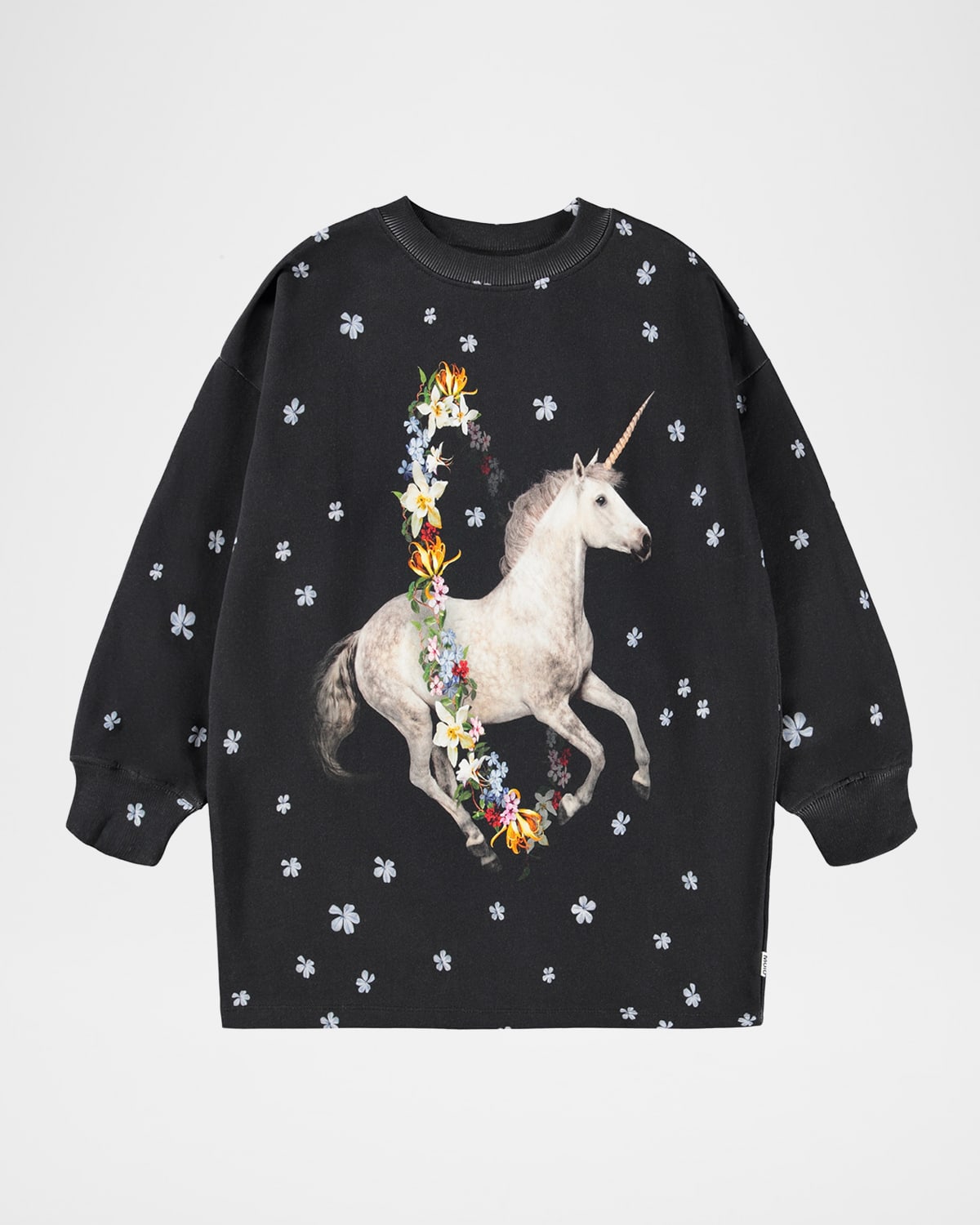Molo "Cyrella" cozy dress features an allover floral print embellished with a unicorn graphic on the front Crew neckline Long sleeves Dropped shoulders Hem falls above the knee Ribbed cuffs and hem Shift silhouette Pullover style Organic cotton Imported