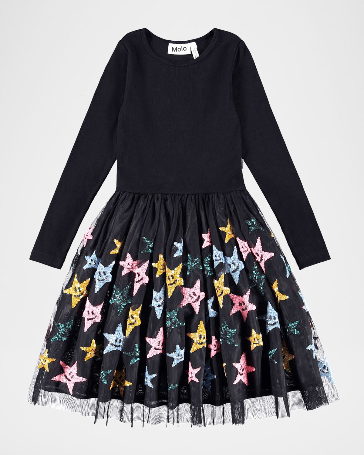 Molo "Cyrus" dress pairs a ribbed cotton jersey top with a matching tulle skirt embellished with sequin stars Crew neckline Long sleeves Knee length Aline silhouette Polyester Imported