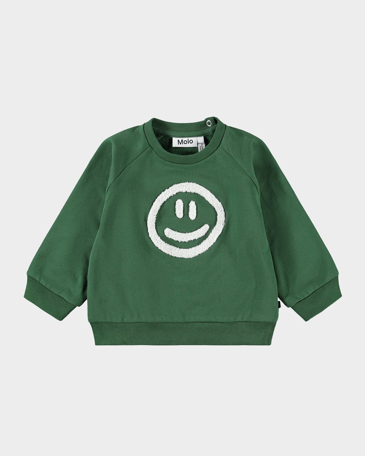 Molo "Dear" soft jersey sweatshirt decorated with a smiling face on the front Crew neckline Long raglan sleeves Ribbed cuffs and hem Back shoulder button closure Organic cotton Machine wash Imported
