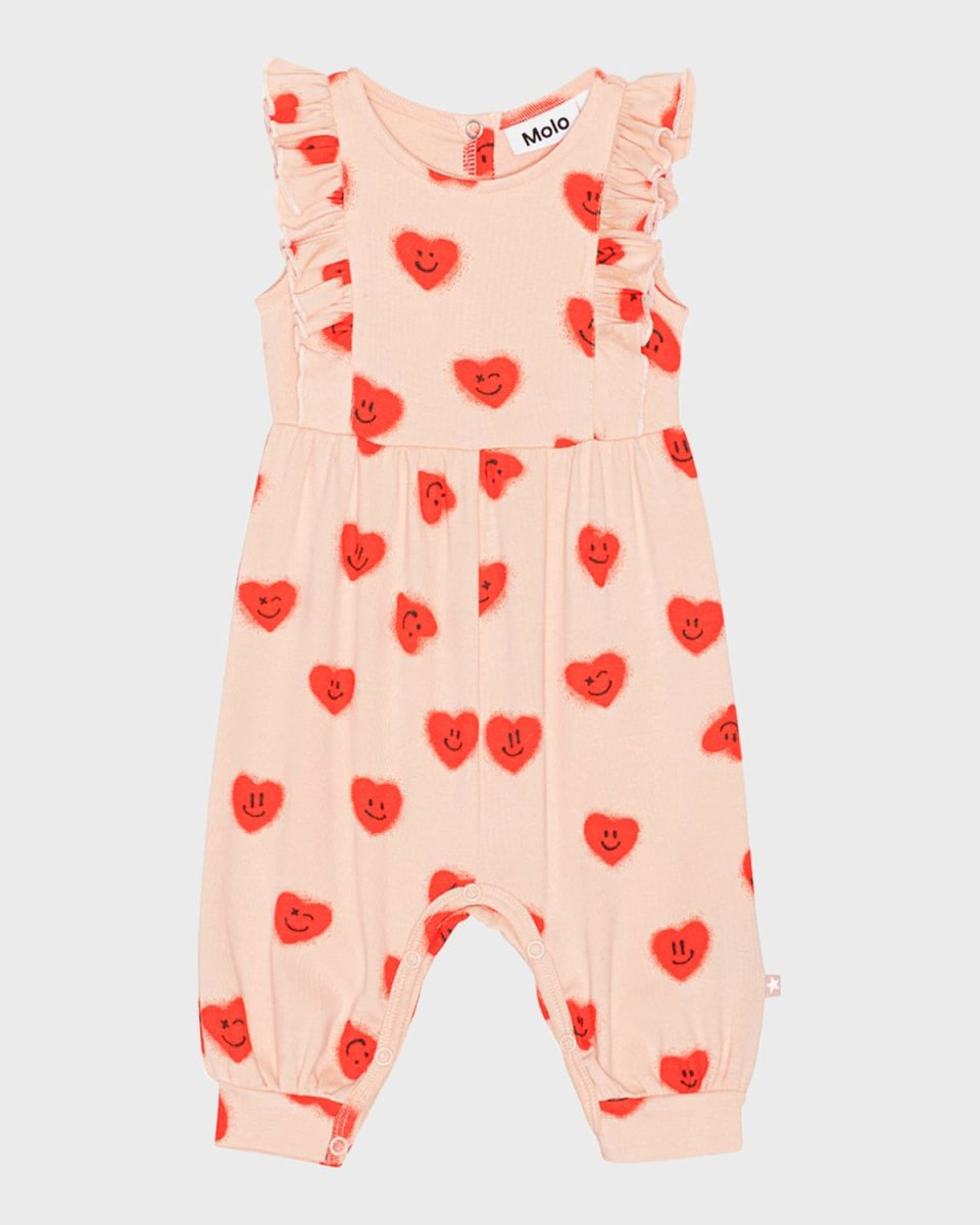 Molo "Fallon" jumpsuit animated with happy face heart motif Round neckline Sleeveless Snap closures at back Snaps through legs Ruffle trim Cotton/elastane Machine wash Imported