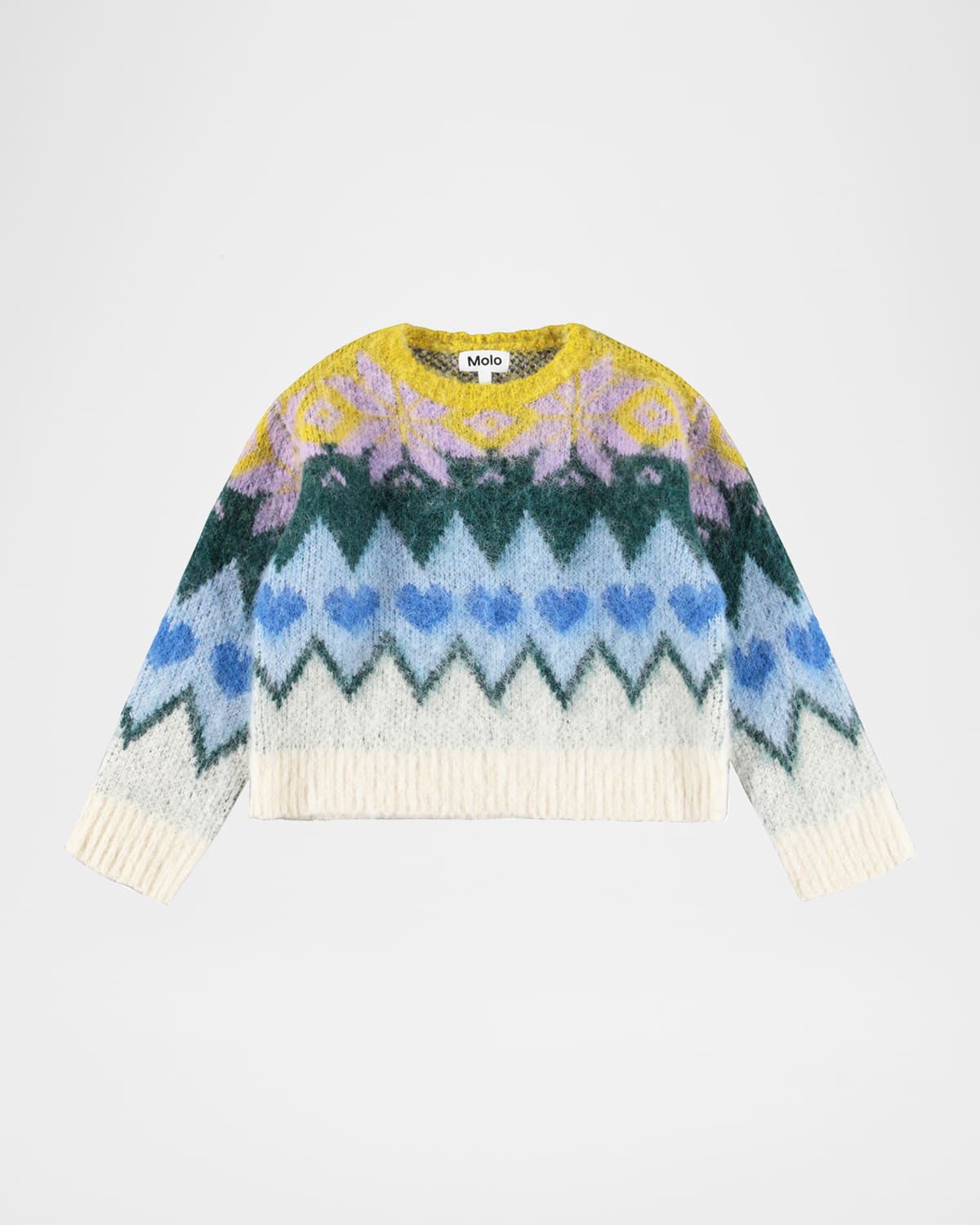Molo fluffy knit sweater features a beautiful multicolor graphic print inspired by Nordic patterns Crew neckline Long sleeves Ribbed cuffs and hem Relaxed fit Pullover style Acrylic/wool Imported