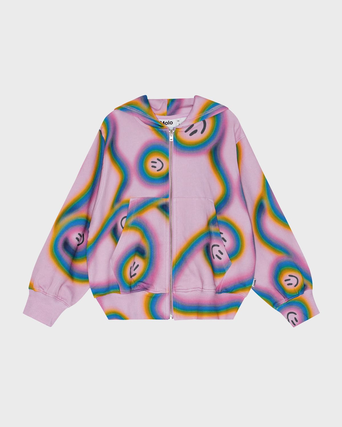 Molo "Mazzelina" hoodie in vibrant happy face motif Hooded neckline Long sleeves Full zip front Split kangaroo pocket Banded cuffs and hem Relaxed fit Cotton Imported