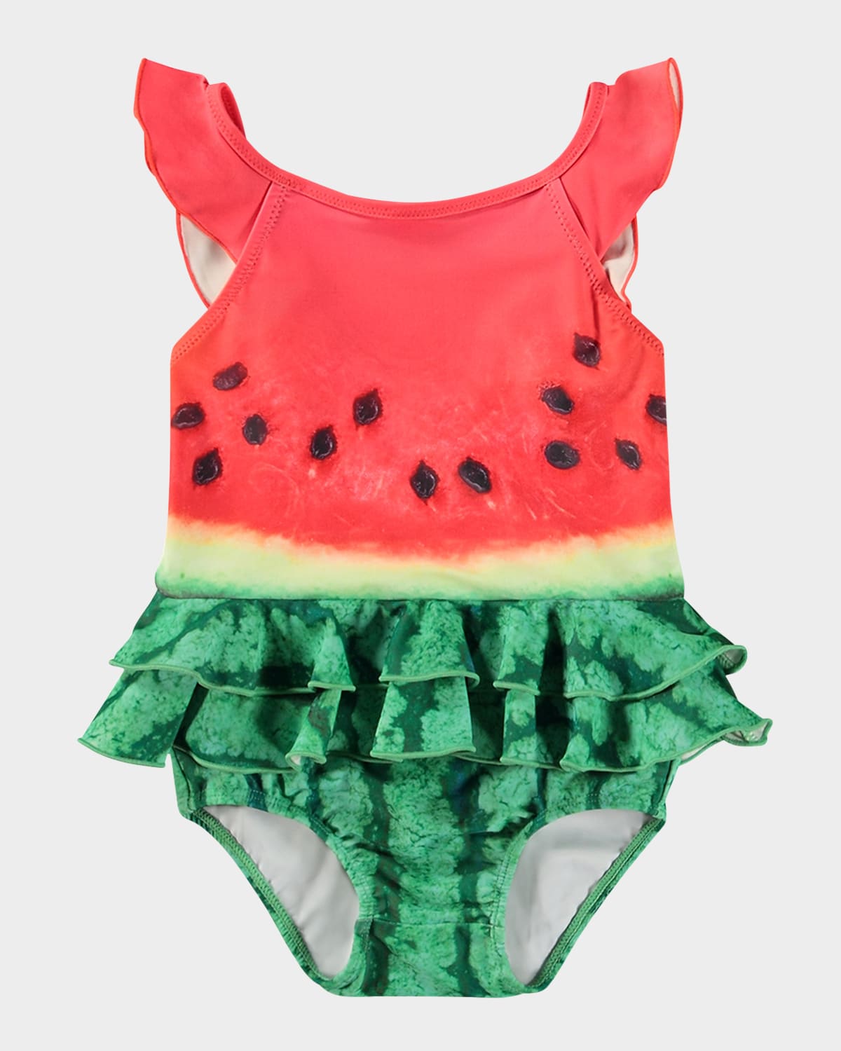 Molo "Nalani" multicolor onepiece swimsuit adorned in a watermelon motif 50+ UV protection Scoop neckline Flutter sleeves Tiered ruffle skirt Elastic cuffs Full seat coverage Polyester/elastane Machine wash cold, wash inside out Imported
