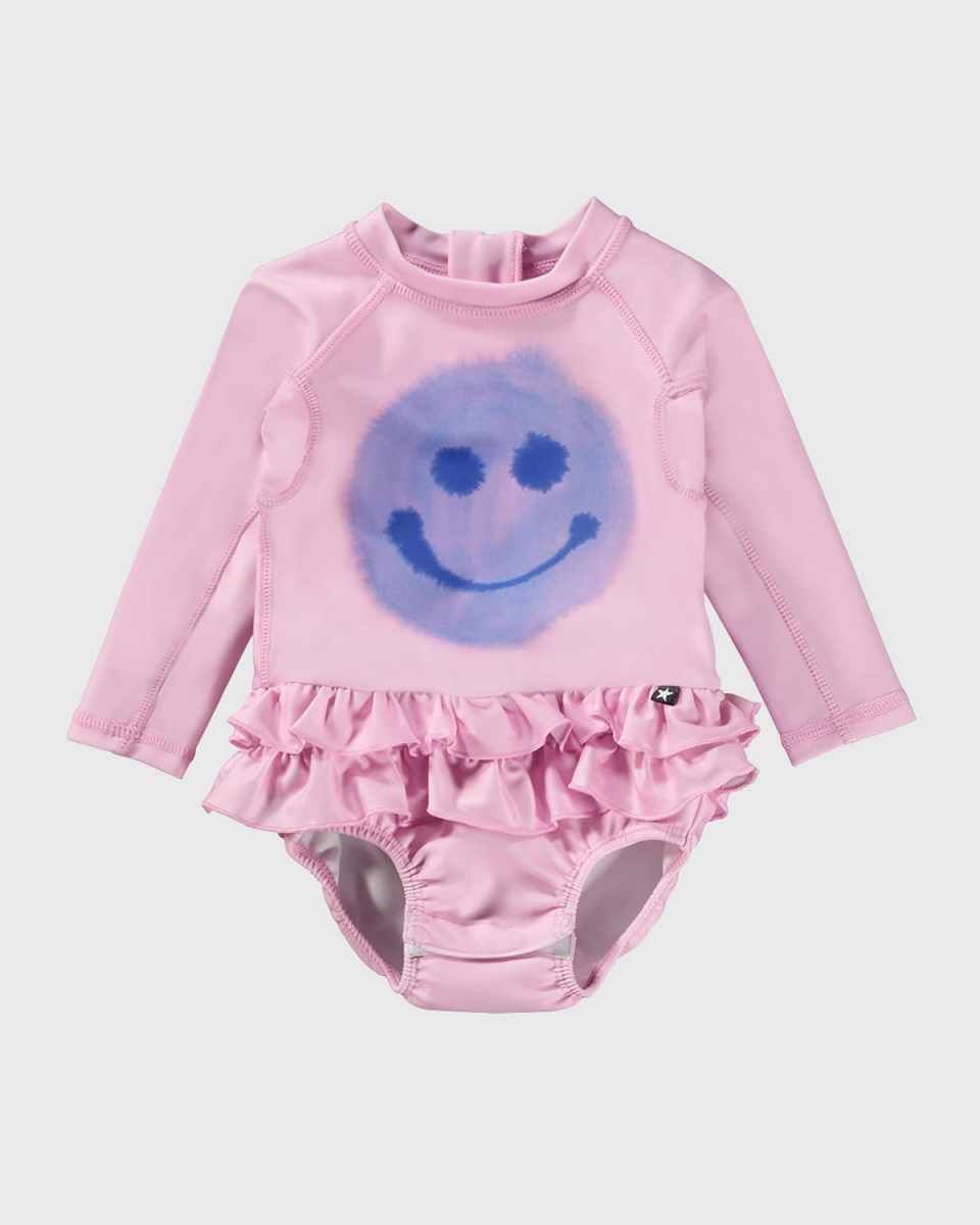 Molo "Narice" onepiece swimsuit with signature happy face at front Round neckline Long sleeves Zip closure at back Full seat coverage Ruffle trim Polyester/elastane Machine wash Imported