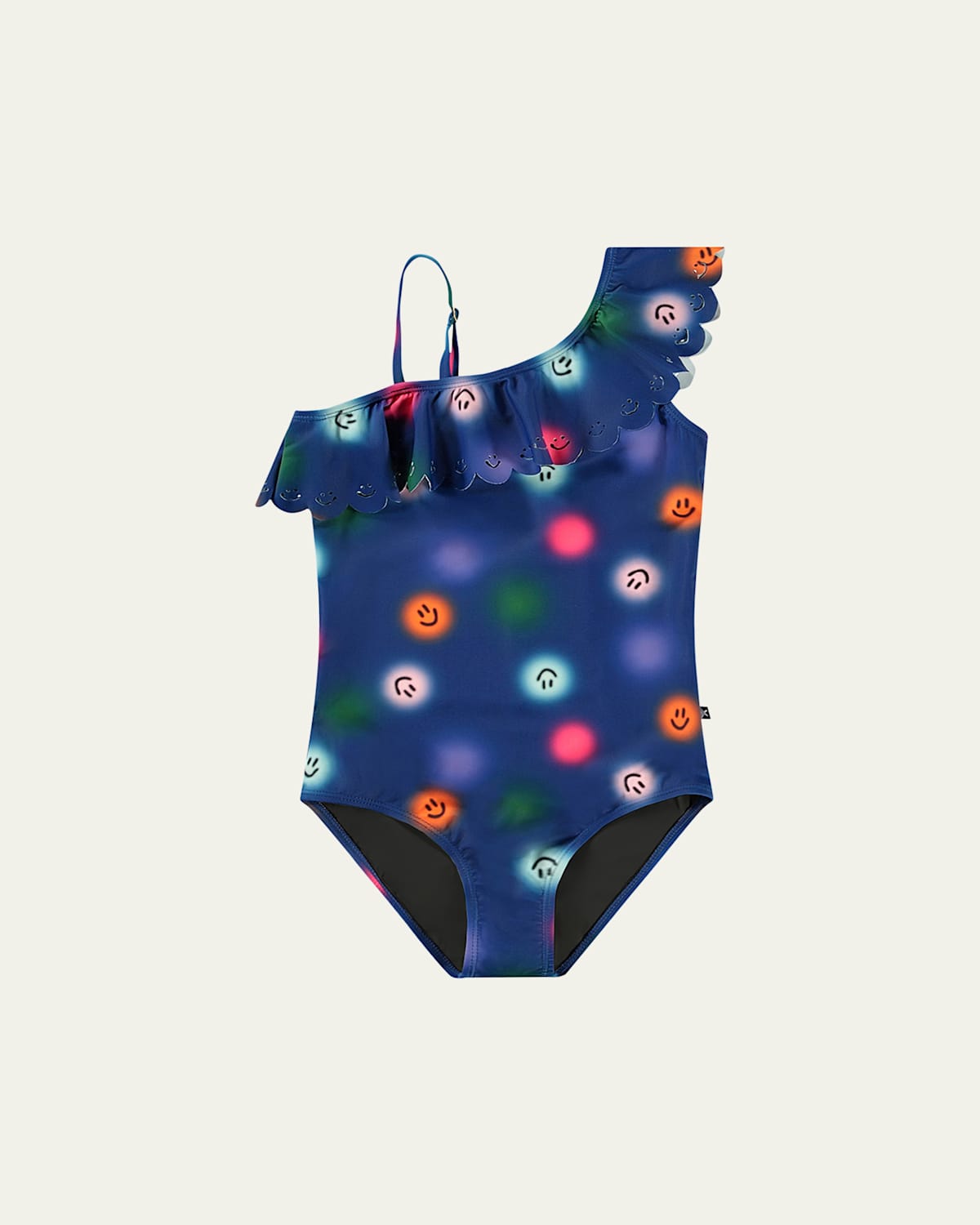 Molo "Net" onepiece swimsuit features an asymmetric ruffle with scalloped trim and smiley cutouts 50+ UV protection Oneshoulder neckline Adjustable strap Full seat coverage Polyester/elastane Machine wash cold, wash inside out Imported