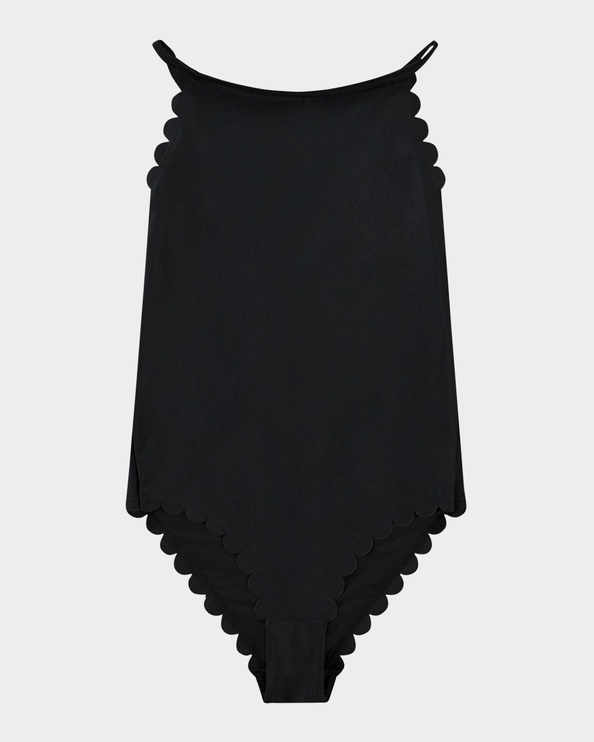 Molo "Noelle" onepiece swimsuit features a scalloped edge along the legs, neck, and back 50+ UV protection Halter neckline; adjustable strap behind the neck Lowcut back Full seat coverage Polyester/elastane Machine wash cold, wash inside out Imported