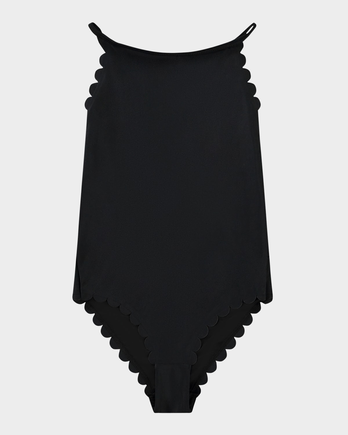Molo "Noelle" onepiece swimsuit features a scalloped edge along the legs, neck, and back 50+ UV protection Halter neckline; adjustable strap behind the neck Lowcut back Full seat coverage Polyester/elastane Machine wash cold, wash inside out Imported