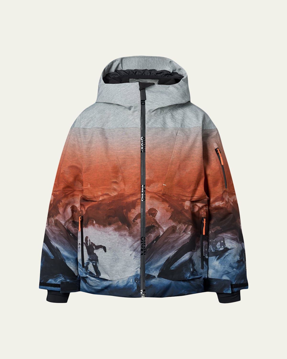 Molo "Alpine" wind and waterproof winter jacket emblazoned with a scenic multicolor snowboard print Lined hood Long sleeves with thumbhole cuffs Ski pass sleeve pocket Interior pocket Reflector increases visibility in traffic Zip front closure Water column pressure: 20,000mm Breathability: 20,000 g/m2/24h Padded with 3M™ Thinsulate™ Polyester Fleece lined Imported