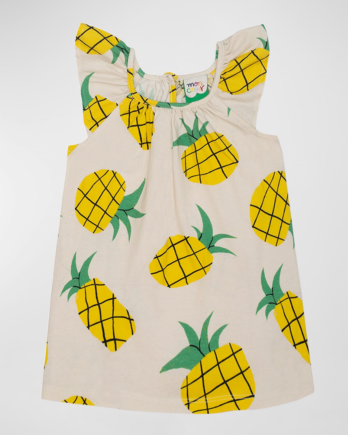 Mon Couer dress with graphic pineapple motif Made from upcycled and recycled materials Round neckline Cap sleeves Button closure at back Slipover style Hem hits around the knee Aline silhouette Cotton Machine wash cold, machine wash line dry Made in Portugal