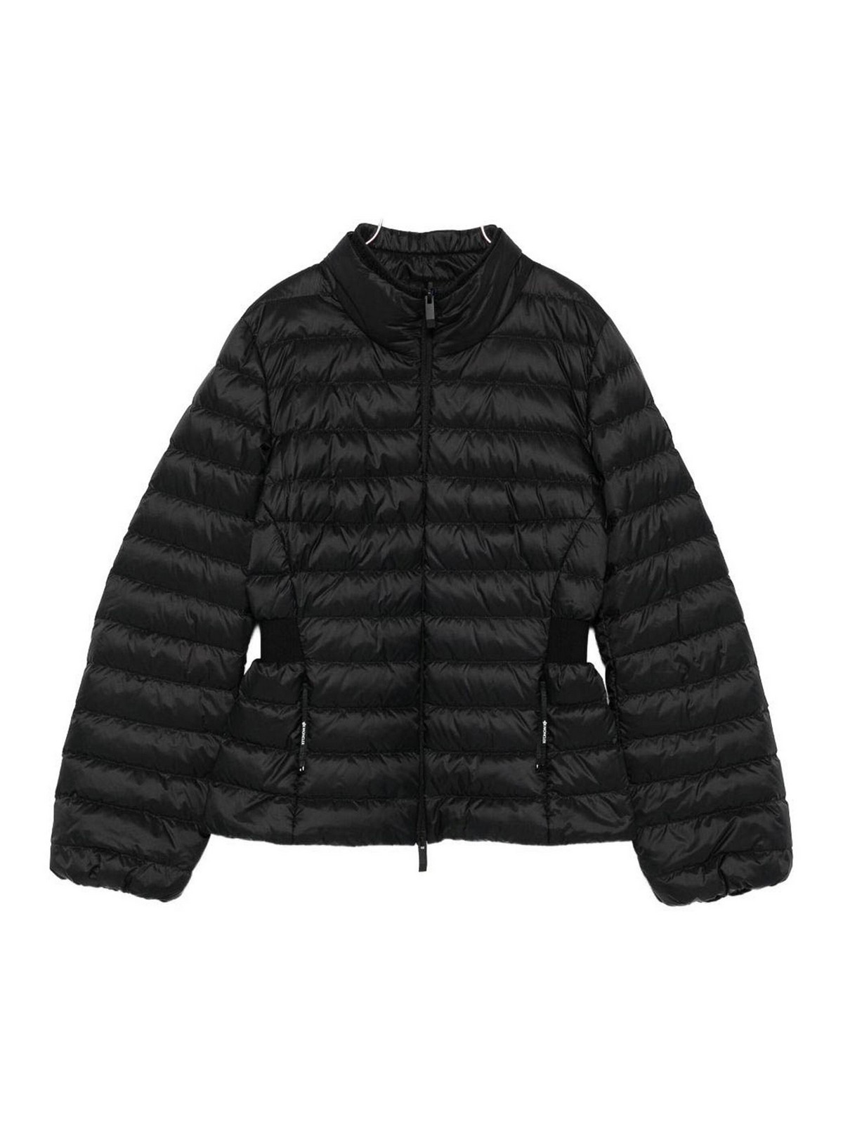 Modèle noir, modèle matelassé avec col montant, ceinture, manches longues, bord droit.