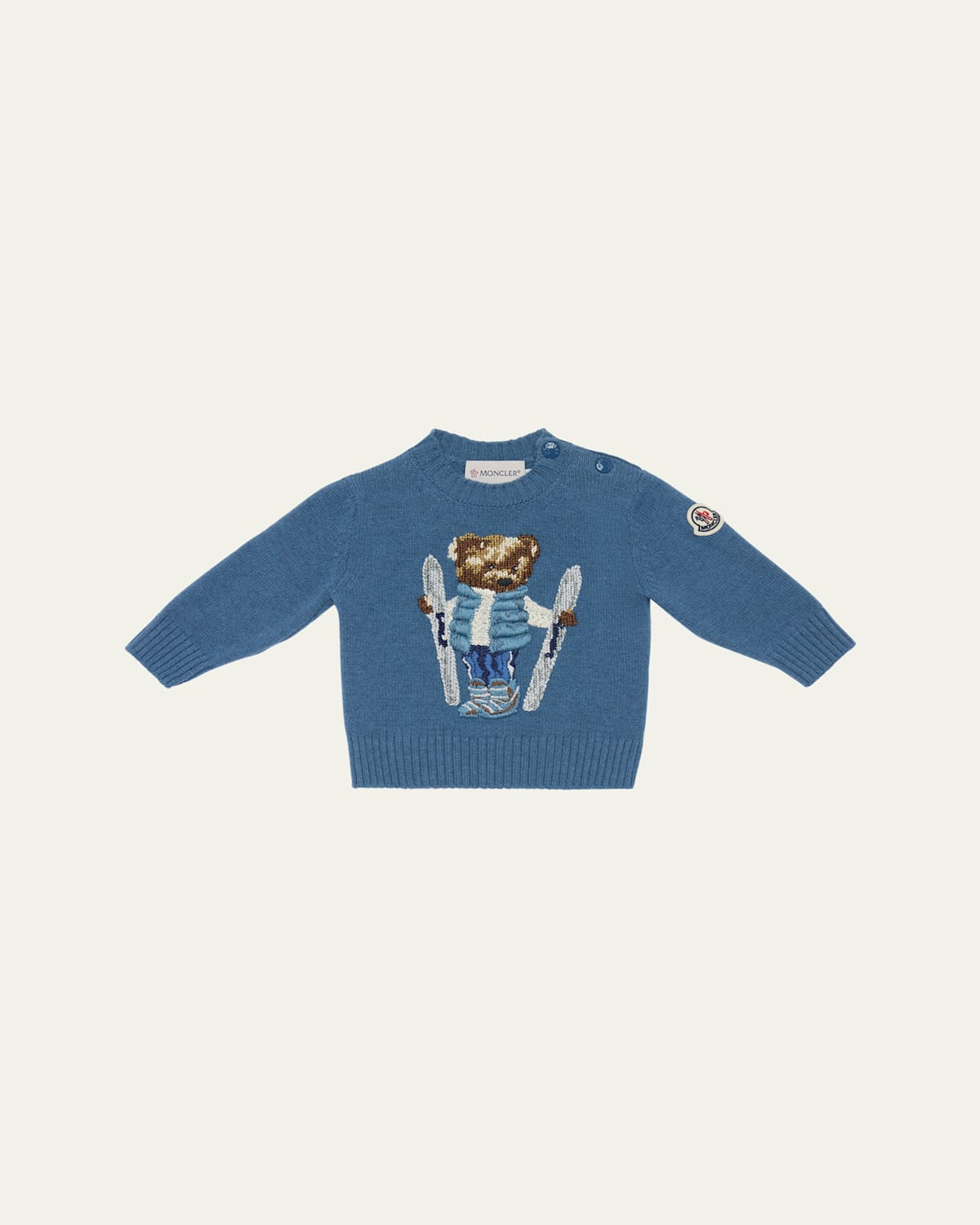 Moncler sweater features a teddy bear ski motif created using a combination of intarsia knitting and embroidery Crew neckline; snaps through the shoulder Long sleeves Felt logo patch on left sleeve Ribbed cuffs and hem Pullover style Virgin wool/cotton Hand wash Made in Italy