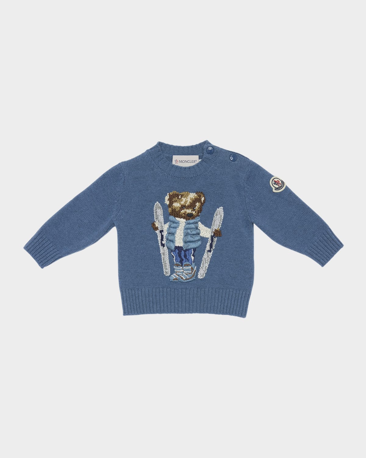 Moncler sweater features a teddy bear ski motif created using a combination of intarsia knitting and embroidery Crew neckline; snaps through the shoulder Long sleeves Felt logo patch on left sleeve Ribbed cuffs and hem Pullover style Virgin wool/cotton Hand wash Made in Italy