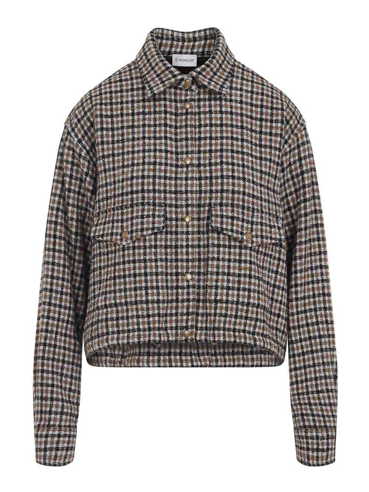 Chemise grise Moncler confectionnée et mélangée, col pointu, rabat latéral boutonné, poches boutonnées, épaules tombantes, manches longues, poignets boutonnés, ourlet asymétrique, motif à carreaux noir et marron