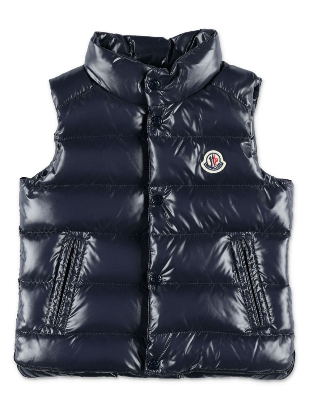 navy blue feather down padded design logo patch at the chest stand-up collar front press-stud fastening two front jetted pockets sleeveless straight hem