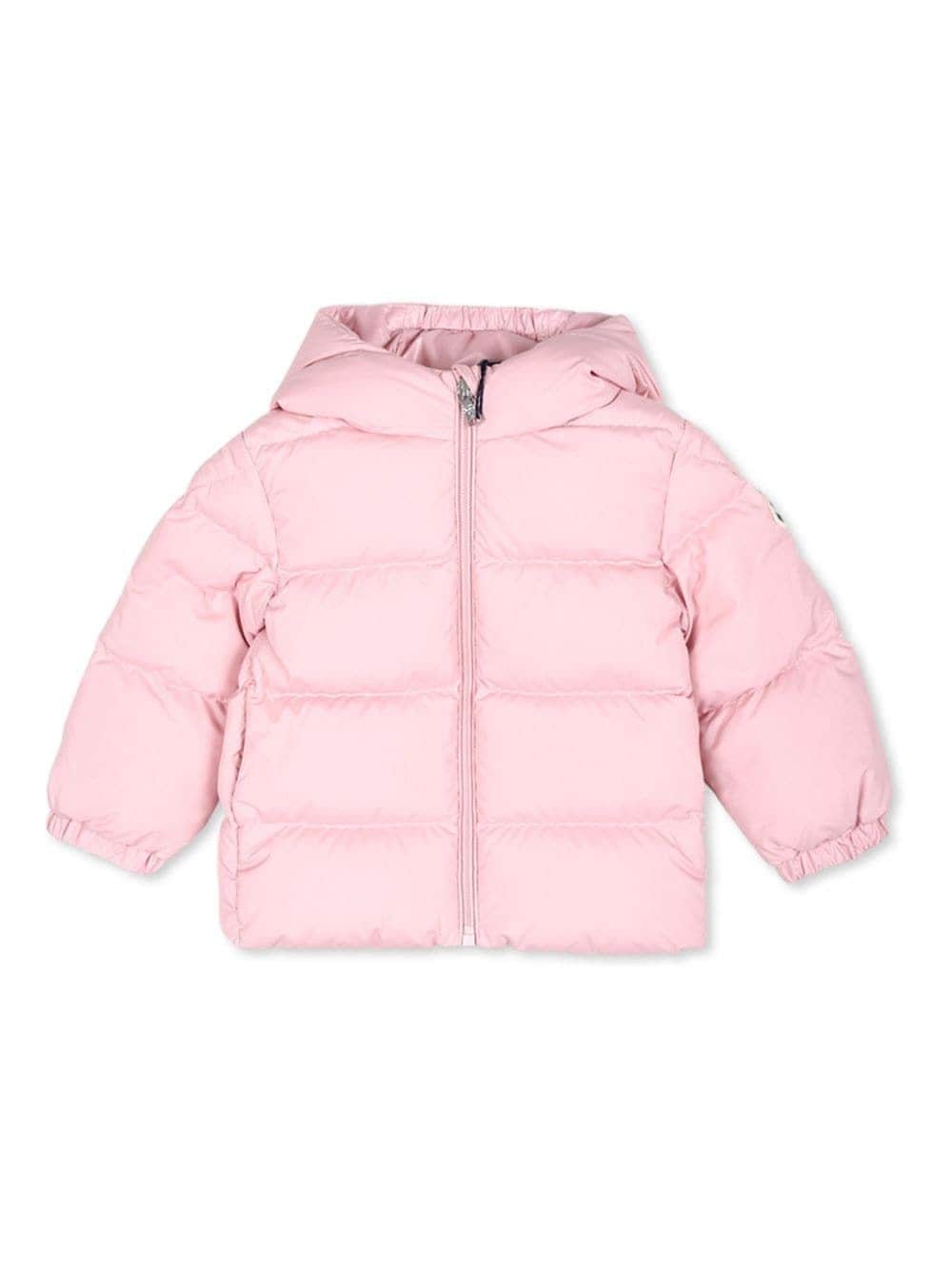 light pink padded design down-feather filling quilted logo patch at the sleeve classic hood front zip fastening long sleeves elasticated cuffs two side stud-fastening pockets straight hem authenticity QR code