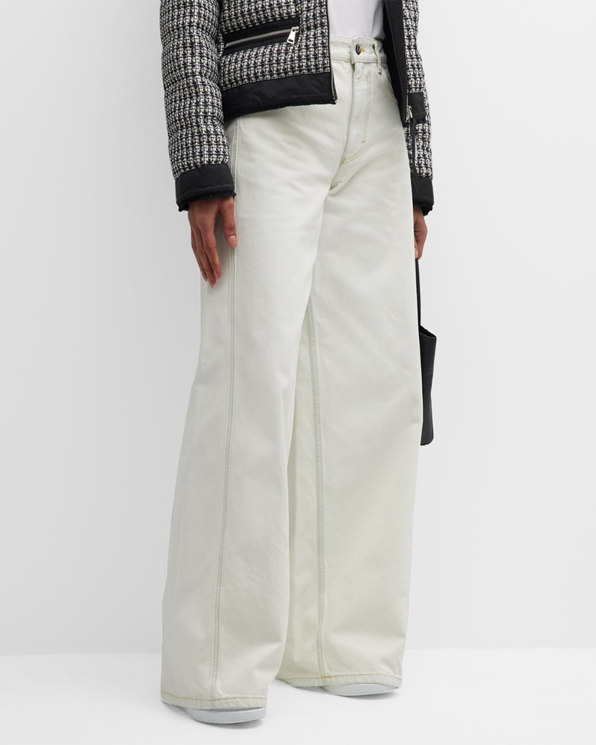 Moncler Genius trouser pants featuring an ultra wideleg styling and contrast seams in collaboration with Alicia Keys Flat front Midrise; sits high on hip Button/zip fly; belt loops Fivepocket style Full length Relaxed fit Cotton/leather Unlined Dry clean Made in Italy