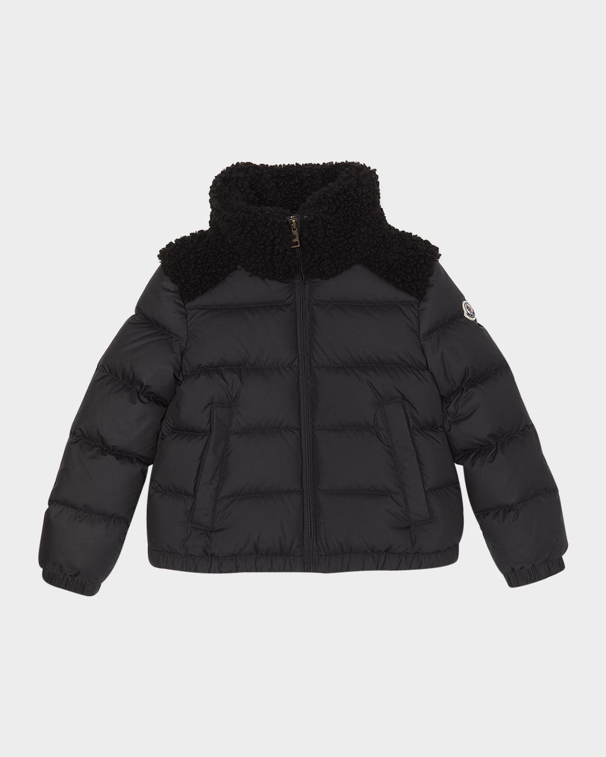 Moncler "Vard" puffer jacket embellished with tonal faux fur (polyester) trim on the collar and shoulders Stand collar; zip front Long sleeves Signature felt logo patch on the left sleeve Front welt pockets Elastic cuffs and hem Polyester Down/feather fill Lining: Nylon Hand wash Made in Romania