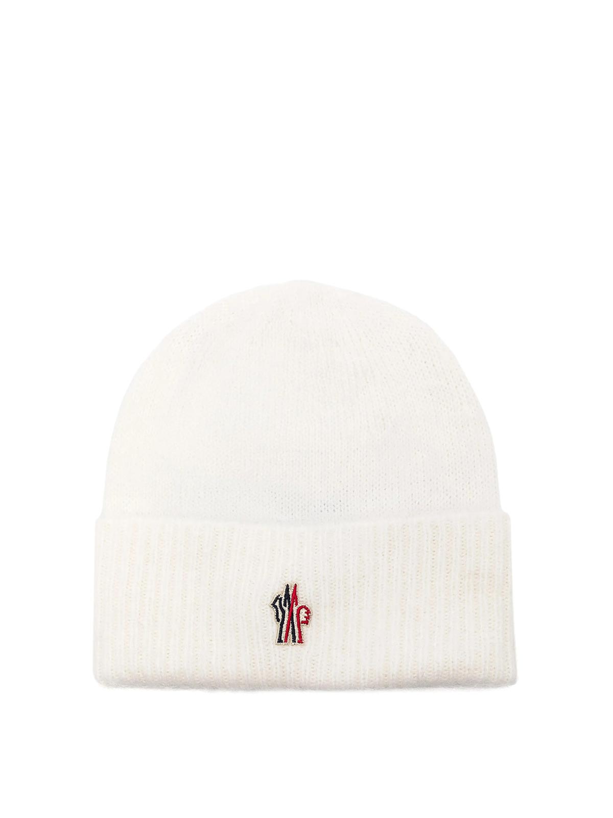 Patch logo beige amande en maille fine mélangée à effet brossé avec bordure côtelée sur le mini-logo, revers et bord relevé