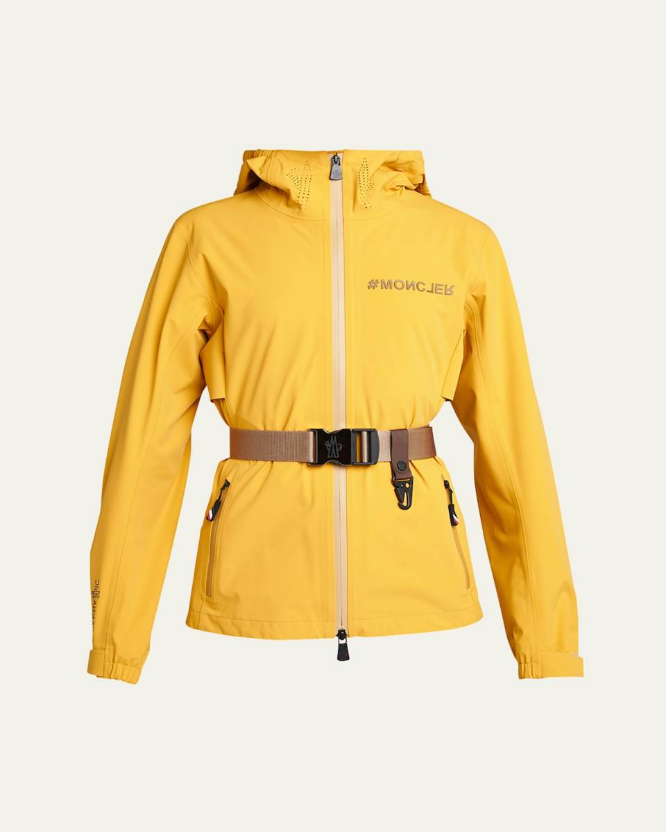 Moncler Grenoble "Fex" jacket with a waterrepellent shell Hooded neckline; twoway zipper closure Logo details at hood and chest Long sleeves with velcro cuffs Adjustable utility belt Side zipper pockets Midlength Relaxed fit Nylon/polyamide/elastane Fully lined Hand wash Made in Romania