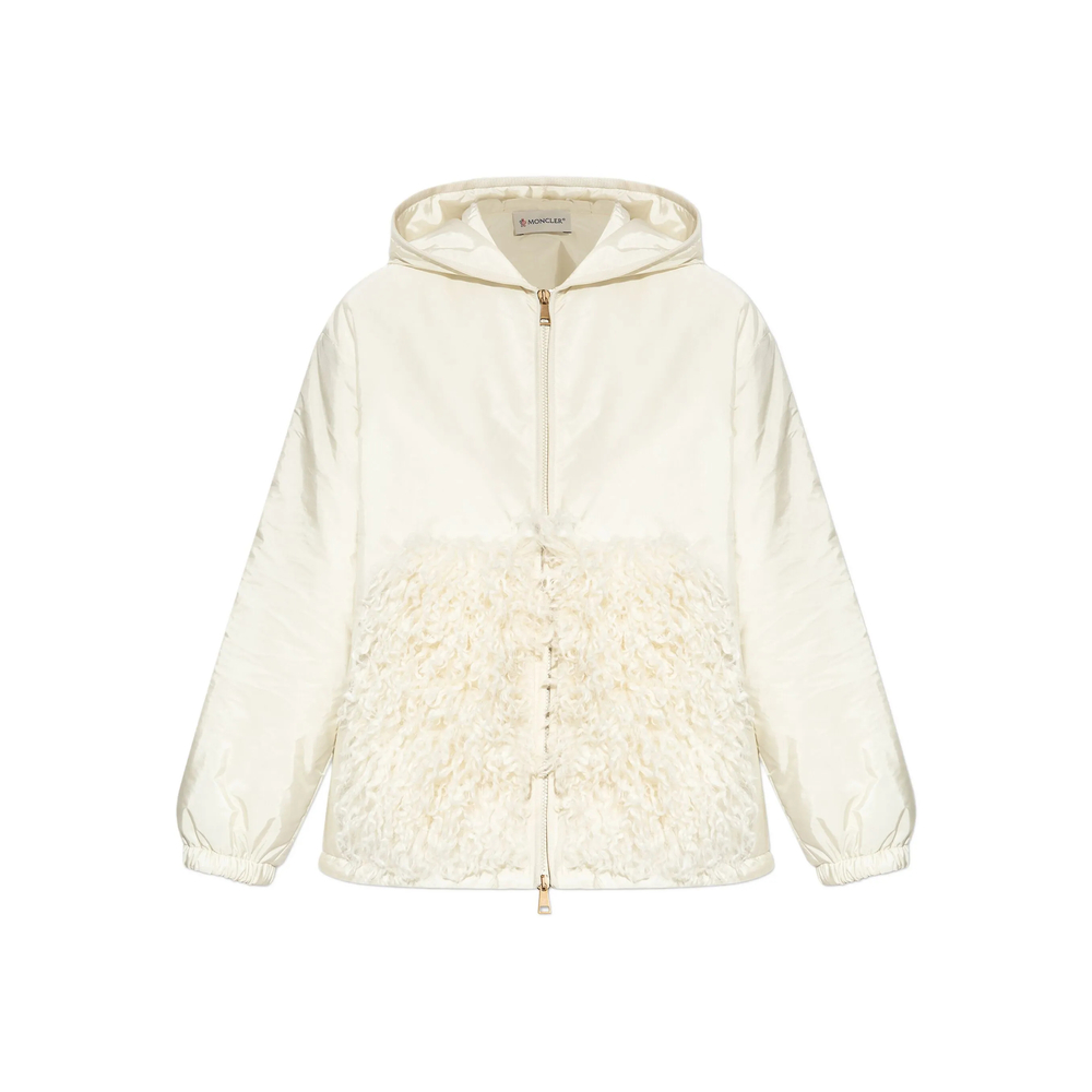 white zip fastening hood curly texture long sleeves elasticated cuffs