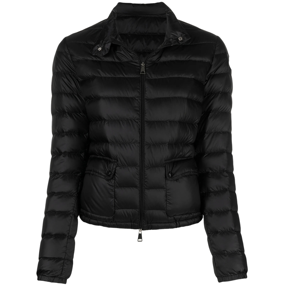 black feather down padded design logo patch at the sleeve stand-up collar front zip fastening two front patch pockets long sleeves straight hem