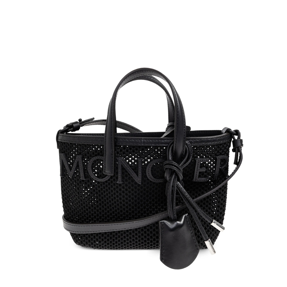 black embossed lettering top handle detachable shoulder strap attached charm knotted detail