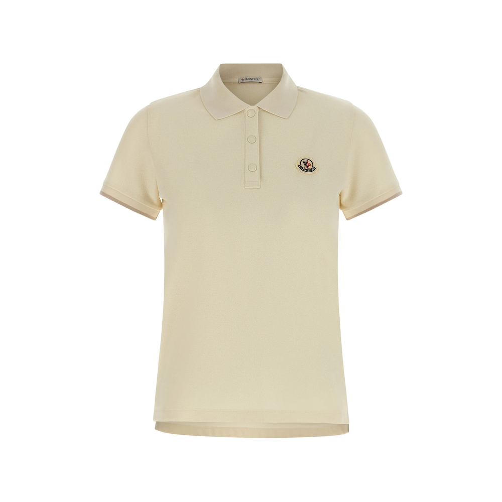 white piqué knit snap-button placket logo patch contrasting trim side slits