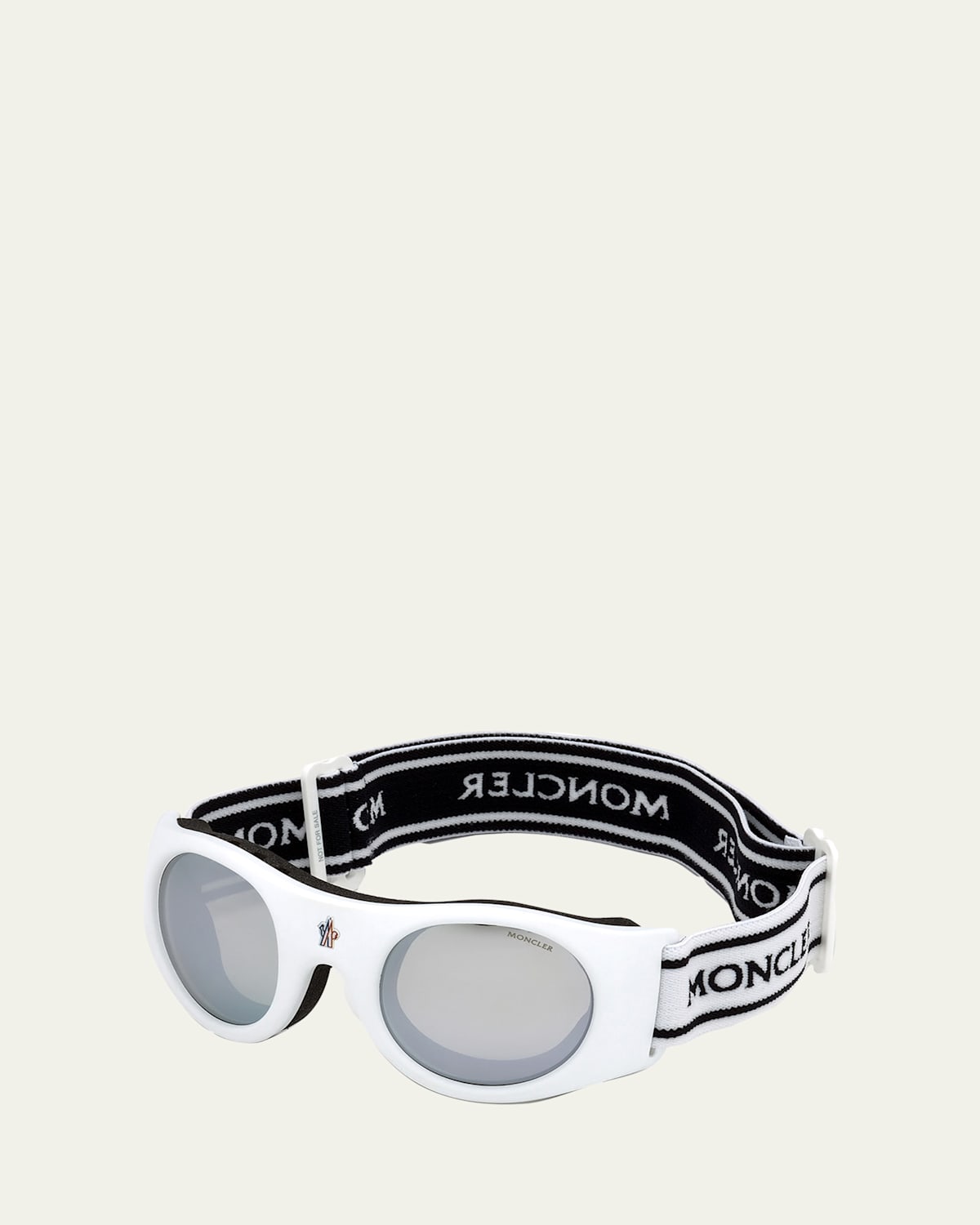 Moncler "City Goggles" round sunglasses with acetate frames. Lens/bridge (in mm): 5526. Mirrored lenses; logo script at left lens. Wide, adjustable elastic logo band wraps around head. Face foam cushion for comfortable fit. Logo detail at nose. 100% UVA/UVB protection. Made in Italy.