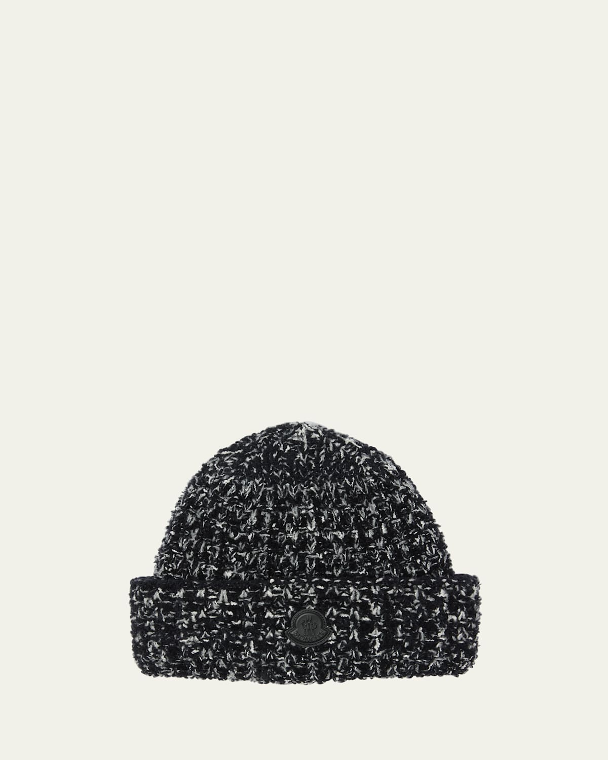 Moncler heavy knit beanie in a marled woolblend Features signature leather logo patch on the front Folded brim Wool/nylon/polyamide/cotton Professional cleaning recommended Made in Italy