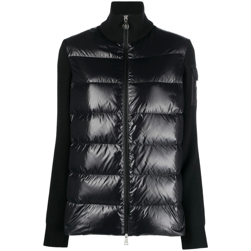 knit-sleeve padded jacket from MONCLER featuring black, virgin wool, feather down, padded design, logo patch at the sleeve, high neck, front two-way zip fastening, contrasting-fabric sleeves, sleeve flap pocket and straight hem.