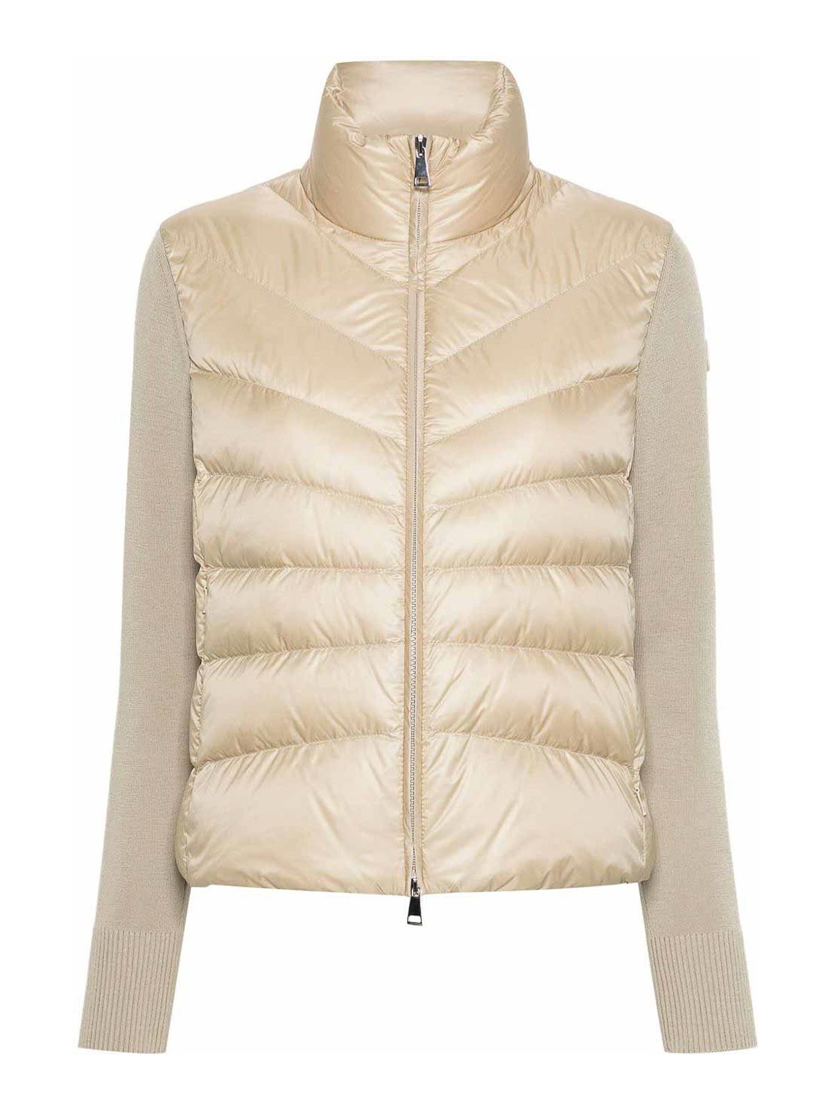 Beige, panneaux rembourrés, col en entonnoir matelassé, manches longues en maille avec poignets côtelés, écusson logo sur les deux côtés, fermeture éclair sur les deux côtés, poches, ourlet droit, fermeture éclair bidirectionnelle matelassée