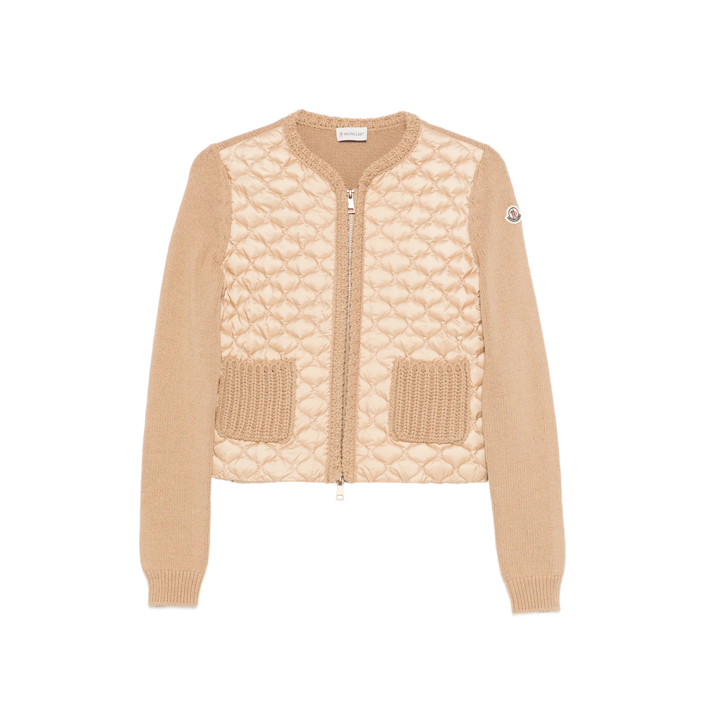 light brown quilted front knit sleeves patch pockets zip fastening round neck