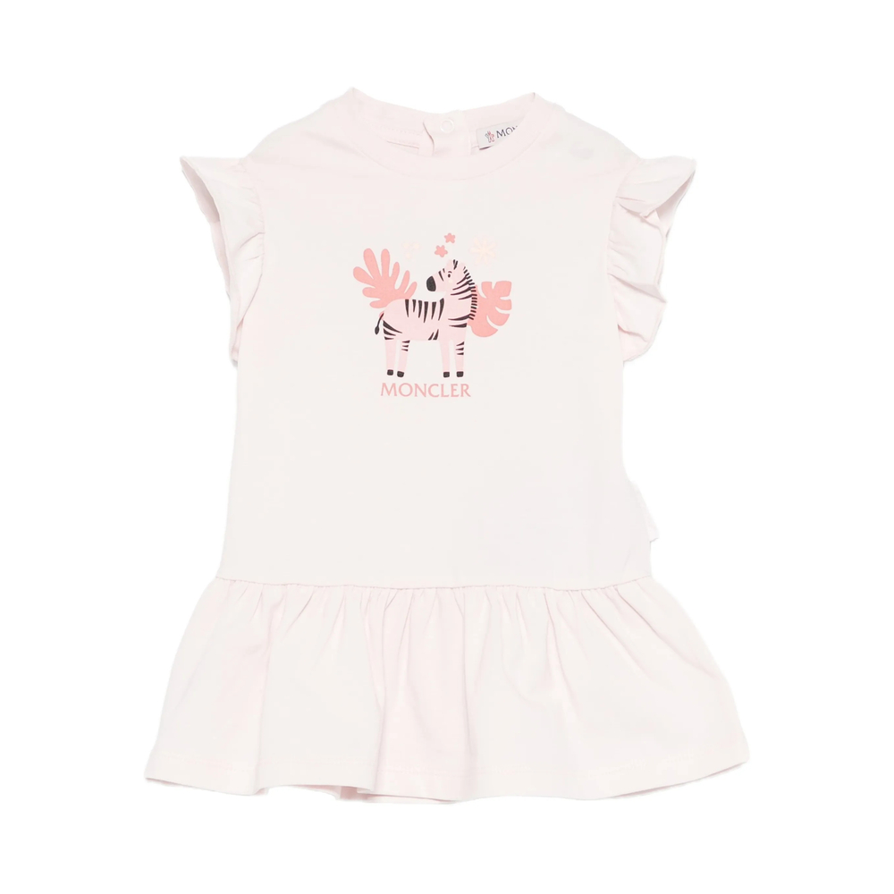 pink graphic print short sleeves ruffle trim drop waist gathered skirt