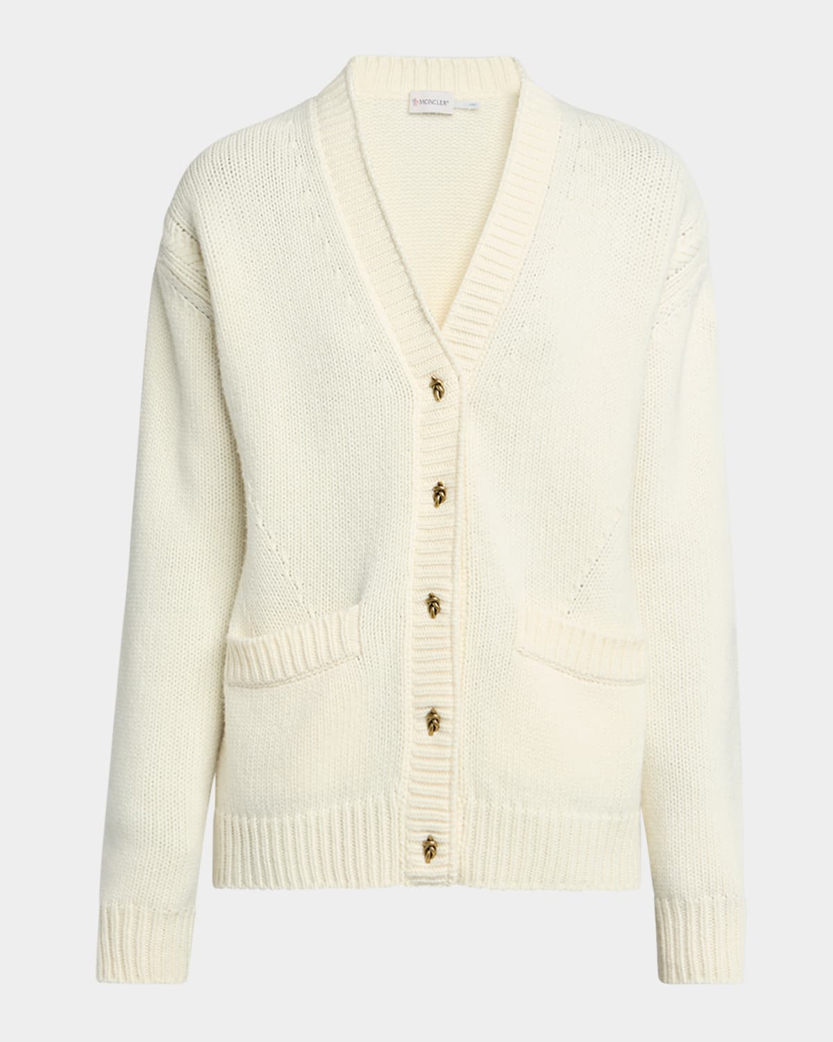 Moncler cardigan crafted from a luxurious wool and cashmere blend, finished with signature metal knot buttons V neckline Dropped shoulders Long sleeves Patch pockets Relaxed fit Hem falls to the hip Buttonfront Virgin wool/cashmere/leather Unlined Professional cleaning recommended Made in Italy
