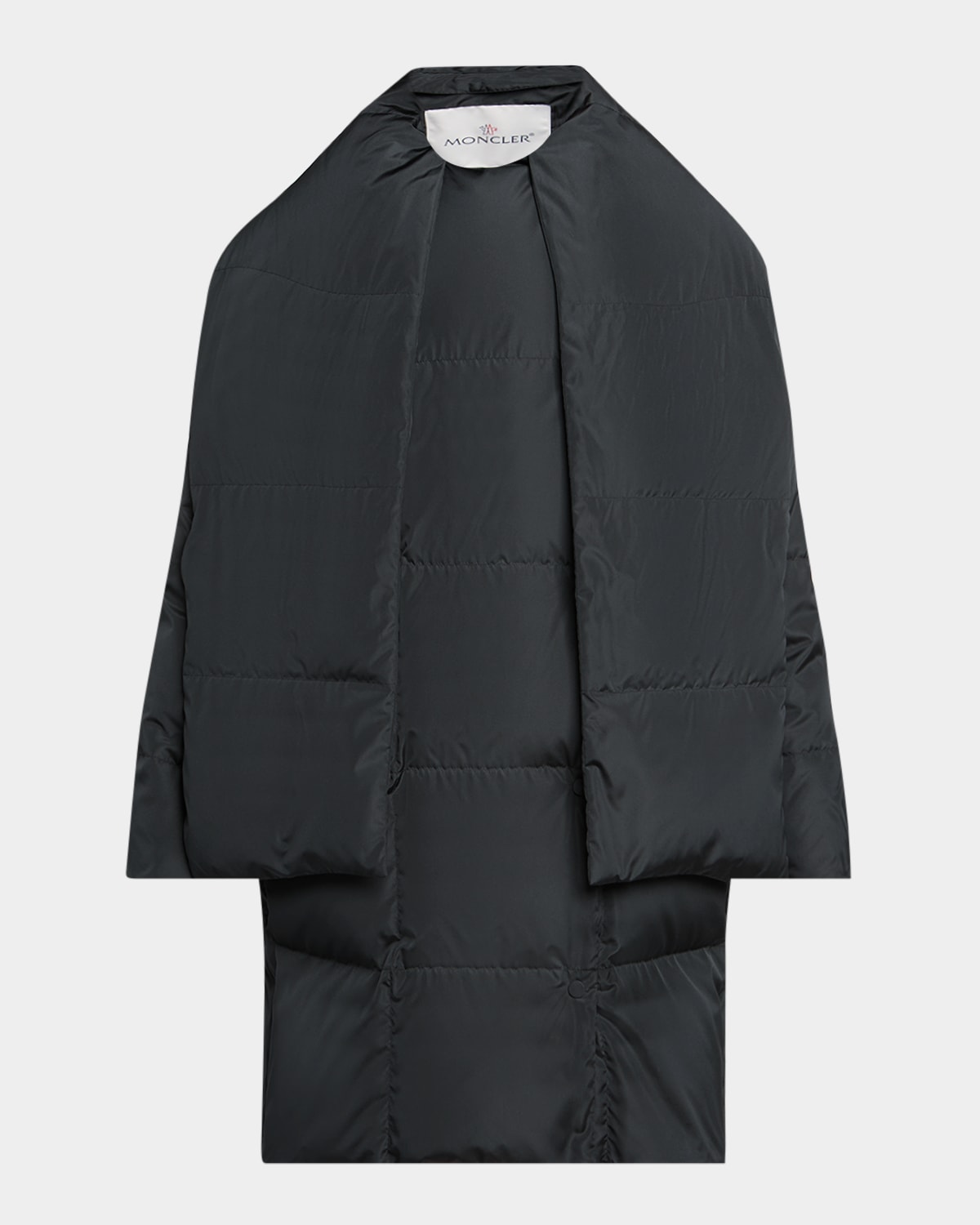 Crafted from a luxurious mulberry silk twill, the "Gaoya" coat from the Moncler x Qiu Hao collection boasts a detachable scarf and foldable collar for versatile styling with supreme warmth. Features signature jacquard logo patch Round neckline Dropped shoulders Long sleeves Invisible side zip pockets Oversized fit Midthigh length Snapfront Polyester/silk Fill: Down/feather Lining: Polyester/silk Dry clean Made in Italy