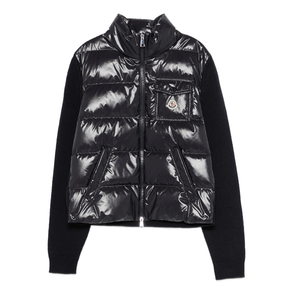 blue padded design zipped closure logo patch long sleeves high neck two side welt pockets chest patch pocket