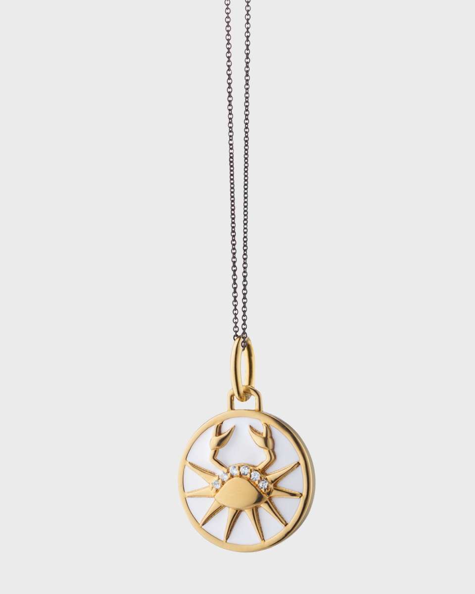Monica Rich Kosann necklace Necklace length: approx. 17 inches 18karat gold vermeil over sterling silver White enamel and white sapphires Black steel chain Adjustable length Lobster clasp Imported