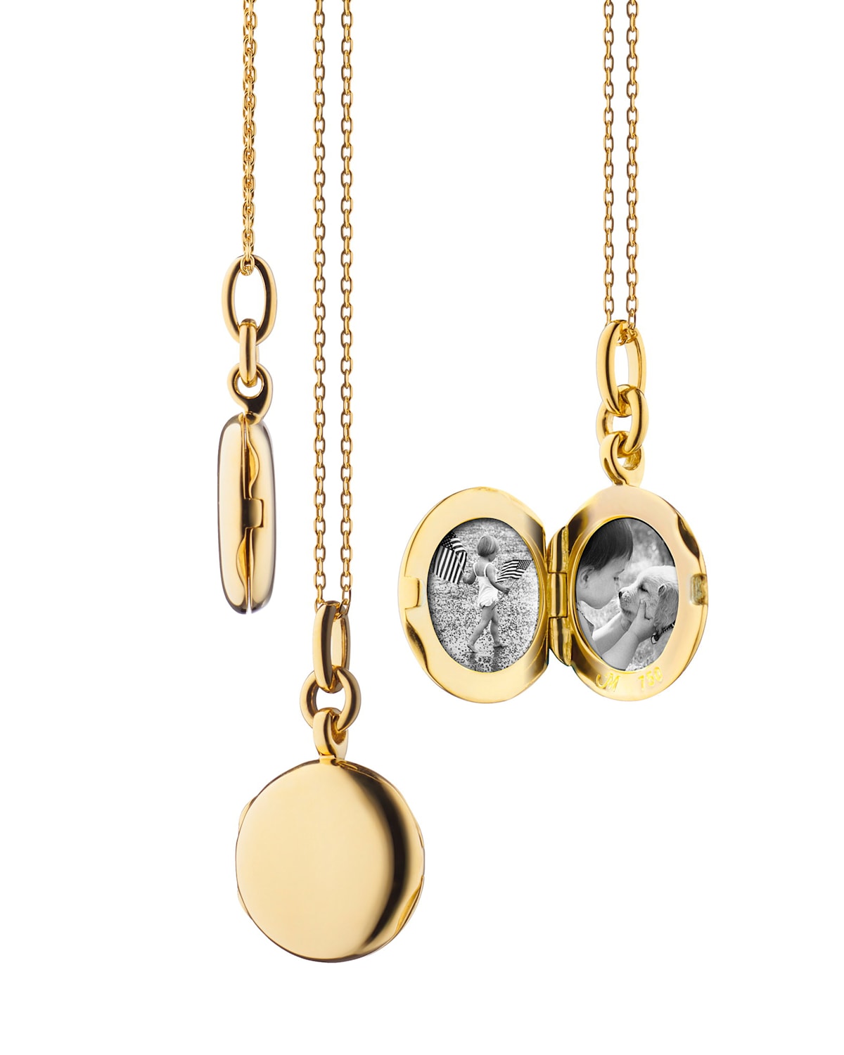 Monica Rich Kosann necklace from the Slim Locket Collection. 18karat yellow gold round locket pendant. Pendant: approx. 0.5"T. Holds two photos. Delicate chain: approx. 17"L. Lobster clasp. Imported.