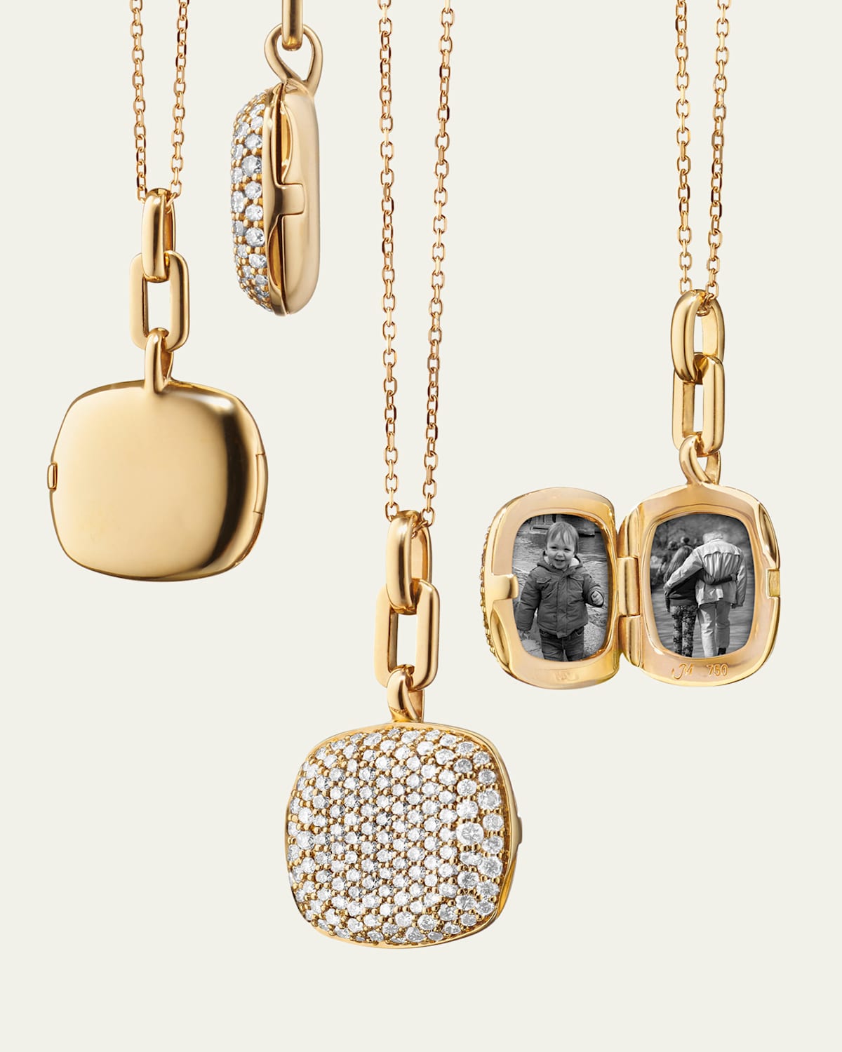 Monica Rich Kosann locket necklace from the Slim Locket Collection Approx. 17 inches 18karat yellow gold Roundcut white diamond pavé Total diamond carat weight: 0.787 Holds two photos Adjustable length Lobster clasp Imported