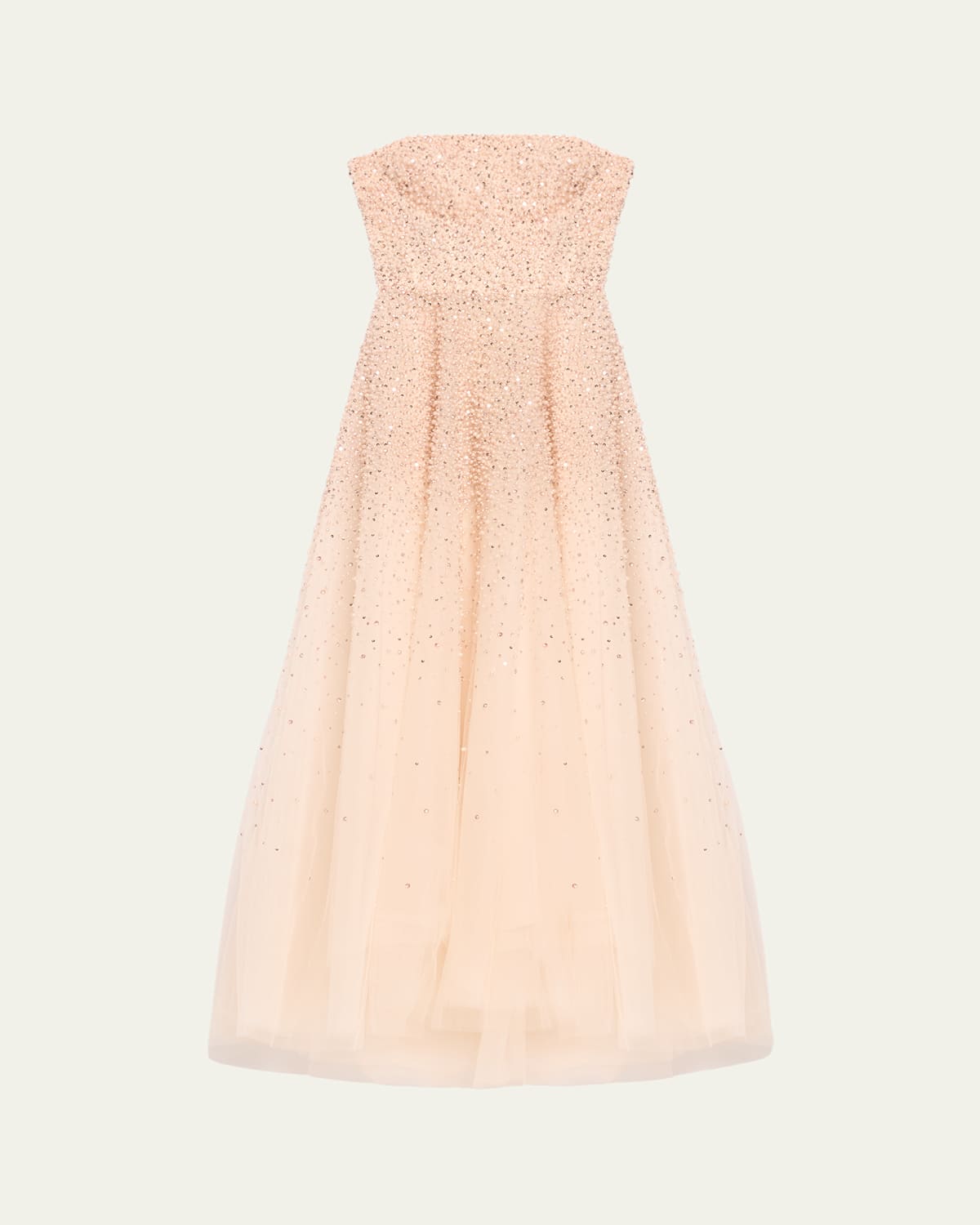 Monique Lhuillier strapless gown features degrade pearly embroidered details throughout Sleeveless Ankle length Aline silhouette Concealed back zip Nylon/polyamide Lining: Silk Spot clean Made in USA from imported materials