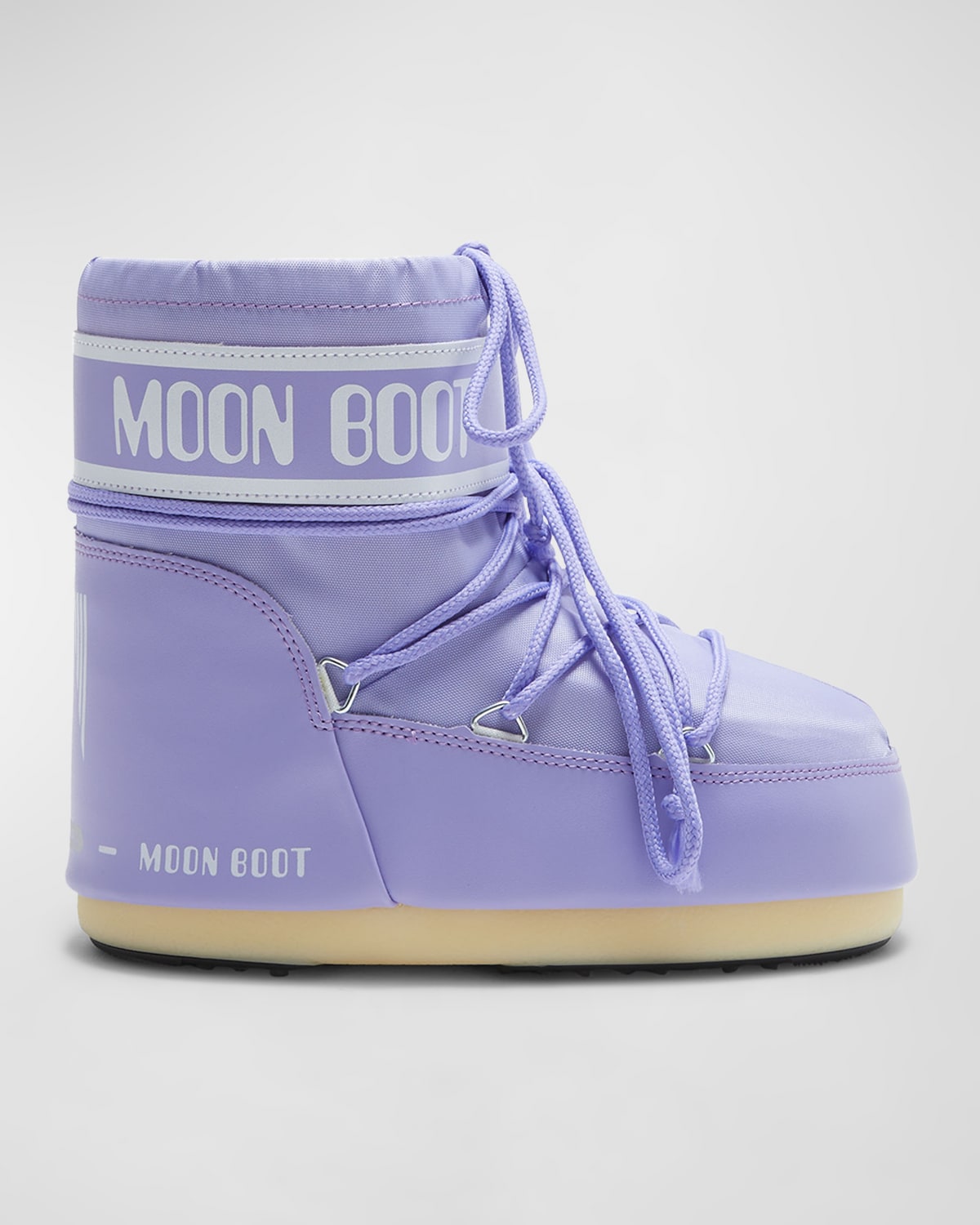 Moon Boot twotone fabric short snow boots with faux leather (polyurethane) and PVC trim Flat heel Round toe Laceup vamp Logo lettering on side Drawstring pull at collar Polyester lining Cushioned footbed Rubber outsole Made in Romania