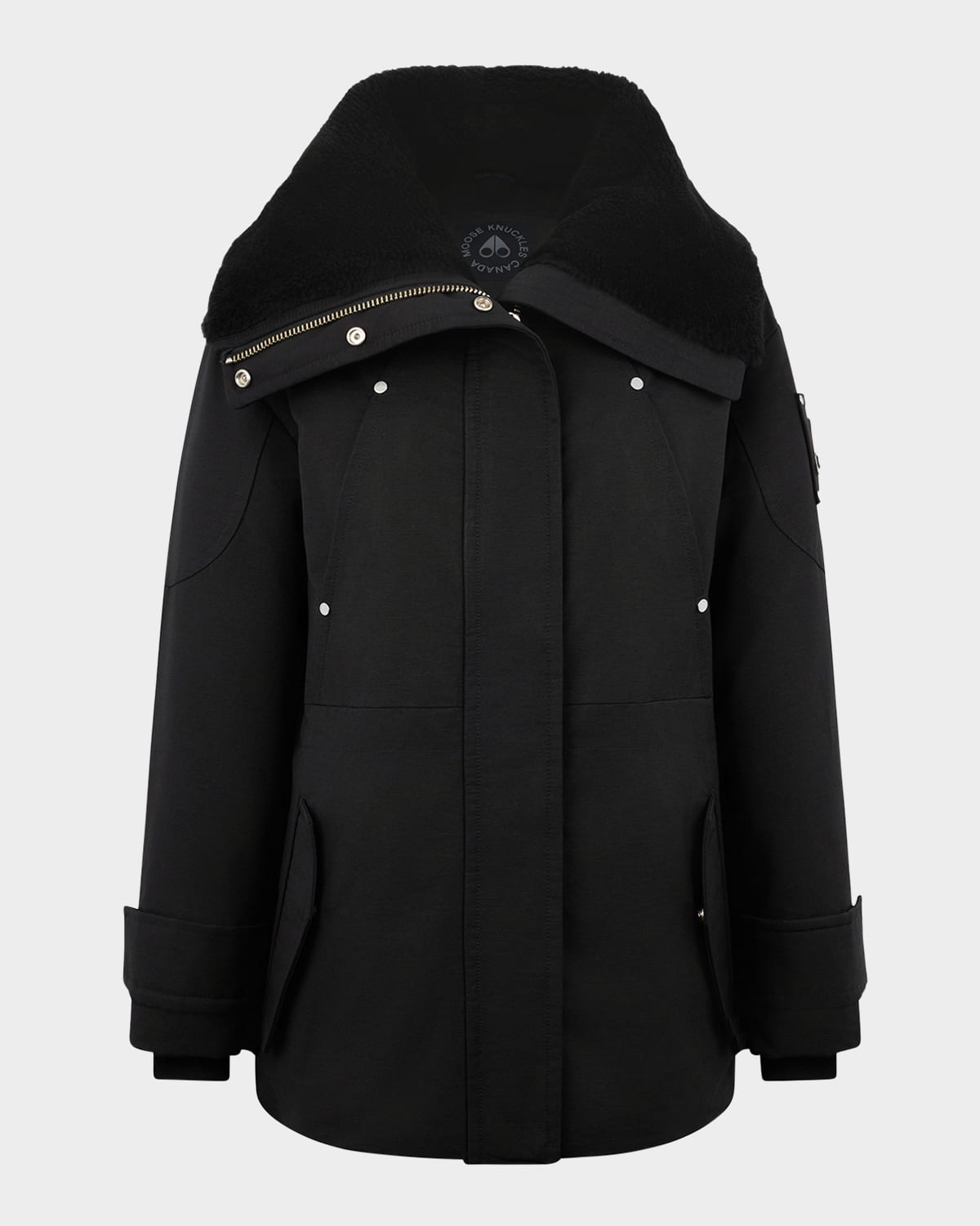 Crafted in waterrepellent and windresistant cotton blend, the "Aurora" jacket by Moose Knuckles features luxurious dyed, curly shearling (Australia) lining for supreme comfort without compromising style. Cold weather protection down to 14°F. Wide collar; zipfront with snap placket Long sleeves with ribknit cuffs Signature metal logo plaque on the left sleeve. Interior drawcord waist Side snap pockets Classic fit Hem falls to the hip Cotton Fill: Down/feather Lining: Nylon Trim: Fur Dry clean only Imported