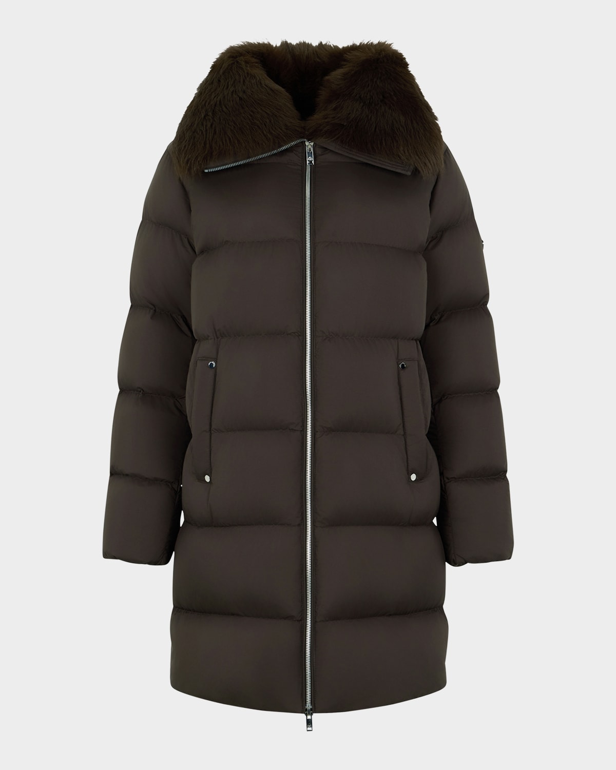 Crafted in nylon, the "Belle Dune" downfilled puffer jacket by Moose Knuckles features a detachable dyed shearling (Spain) collar for versatile styling and extra warmth. Cold weather protection down to 4°F. Stand collar; twoway zipfront Long sleeves Signature metal logo plaque on the left sleeve. Side snap pockets Relaxed fit Midthigh length Nylon/polyamide Fill: Down/feather Lining: Nylon Trim: Fur Dry clean; remove detachable trims before cleaning Imported